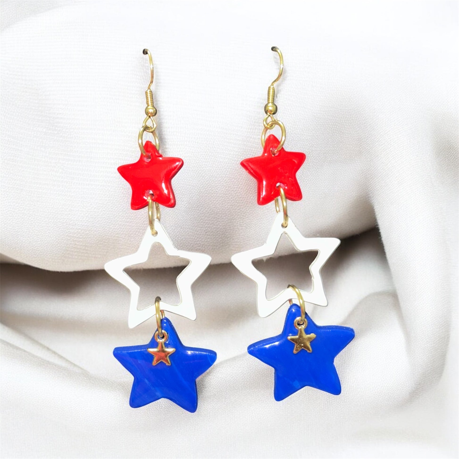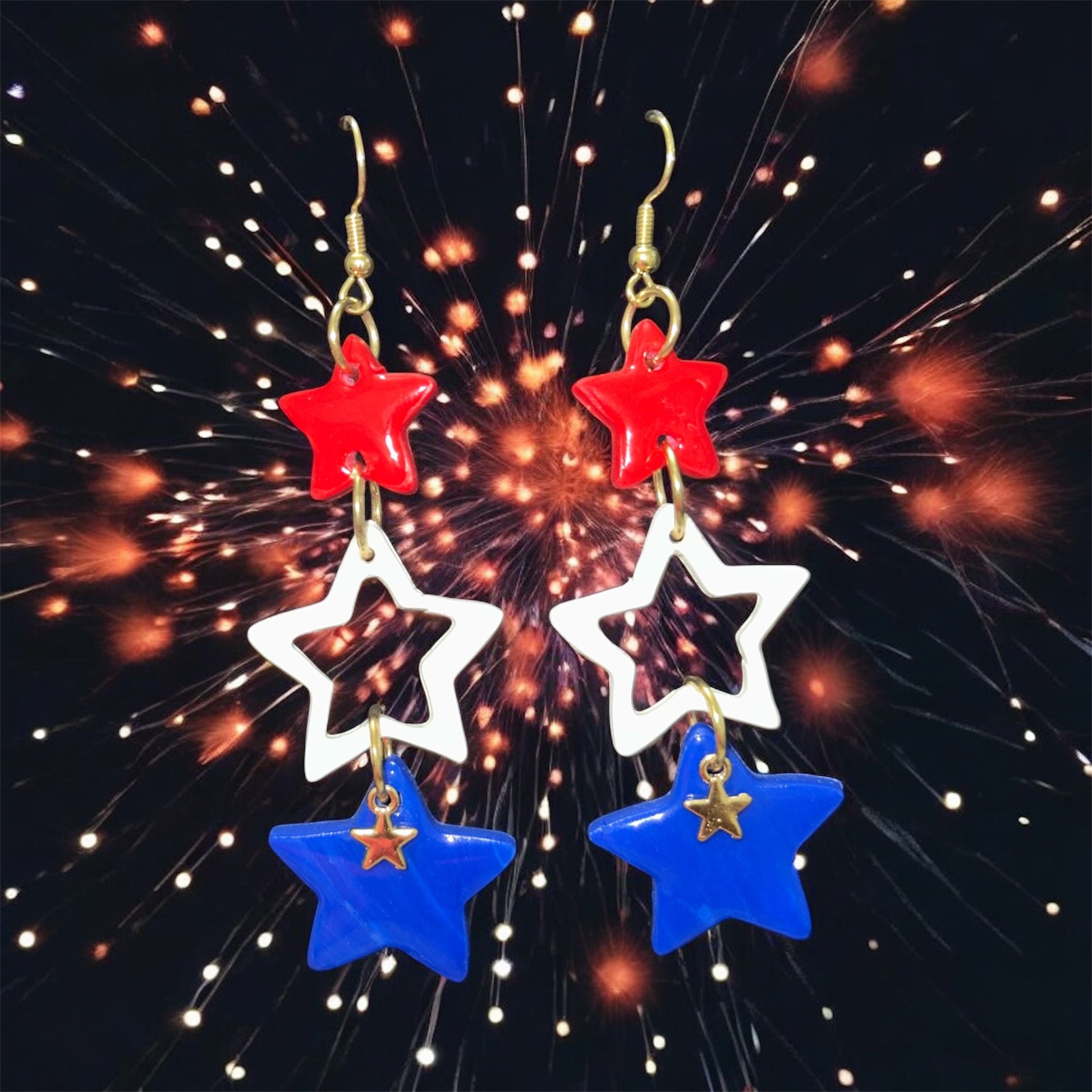 These bold and playful earrings feature a patriotic stack of stars in red, white, and blue. A glossy red star sits at the top, followed by a sleek white open-frame star, and finishes with a solid blue star accented by a tiny gold charm for extra shine. The tiered design adds movement and flair, making them the perfect statement piece for Fourth of July celebrations, parades, or showing off your American pride any day of the year. Lightweight yet eye-catching, they're a festive staple for summer fun.