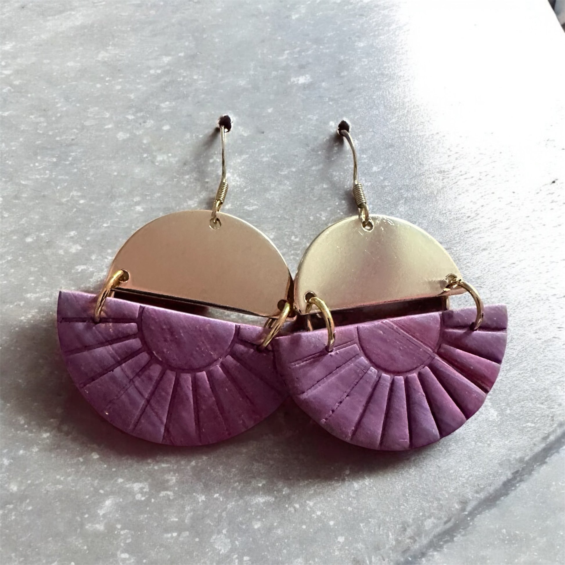 Add a bold and elegant flair to your look with these handcrafted Art Deco-inspired fan earrings. Featuring a striking combination of matte purple polymer clay and shiny gold-toned metal, these semi-circle drop earrings are designed to turn heads. The engraved fan pattern adds texture and depth, while the lightweight construction ensures all-day comfort.