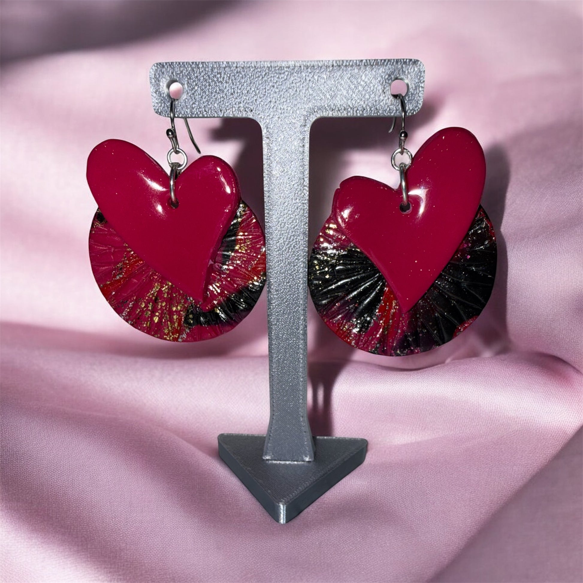 Bold and unapologetic, Crimson Confession Hearts are designed to be seen and felt. High-gloss crimson resin hearts drop over hand-poured marbled resin discs, infused with dramatic black swirls and metallic gold accents. Each backing is uniquely patterned, making every pair one of a kind—no edits, no filters, no duplicates. These earrings celebrate contrast and confidence, blending sweetness with edge for a statement that’s raw, expressive, and unmistakably you.