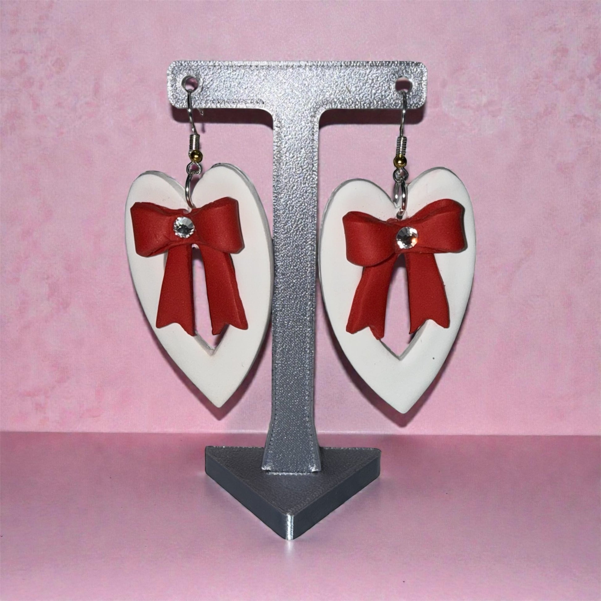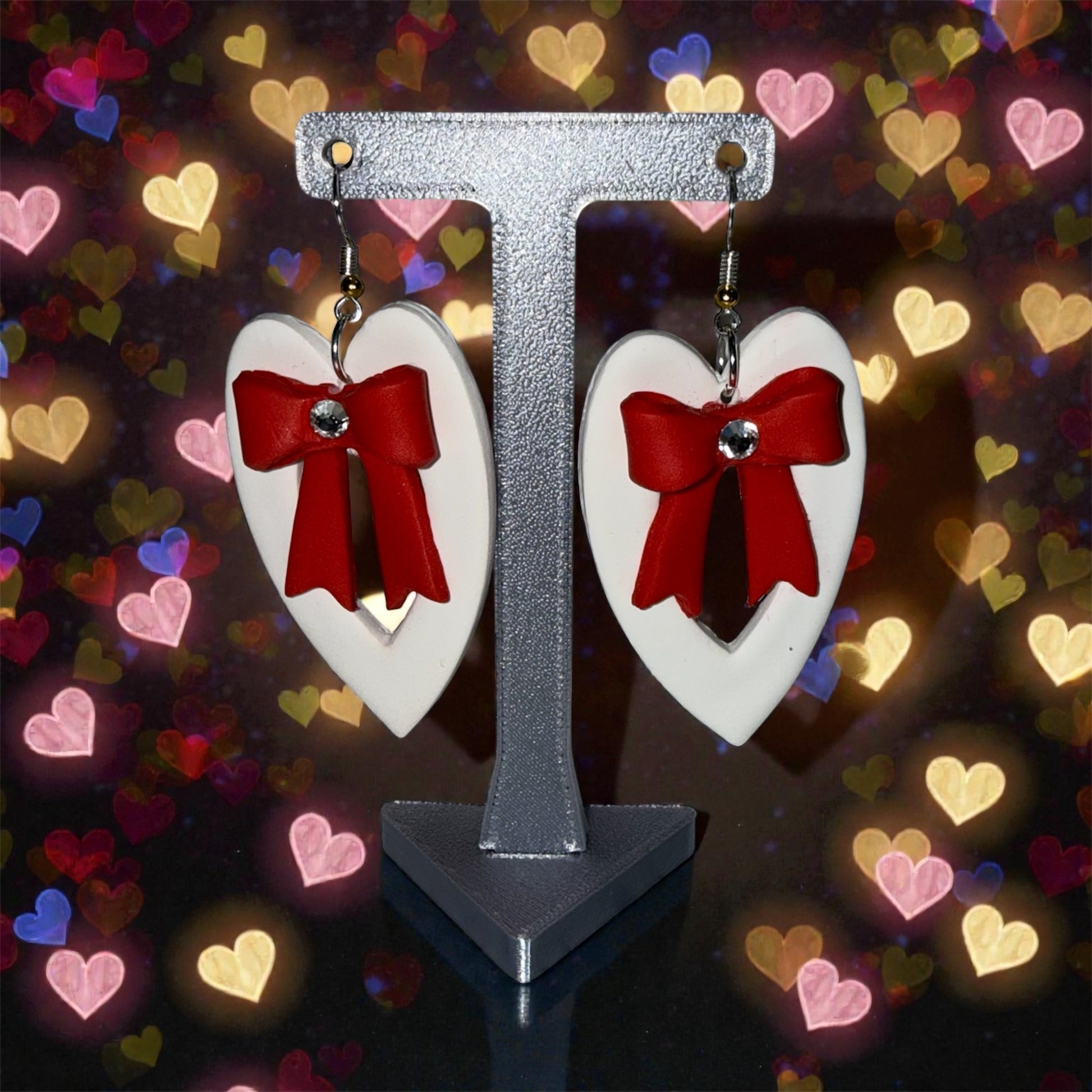 Crisp white hearts topped with bold red bows deliver a playful yet polished romantic look. Sweet, statement-making, and full of charm.
