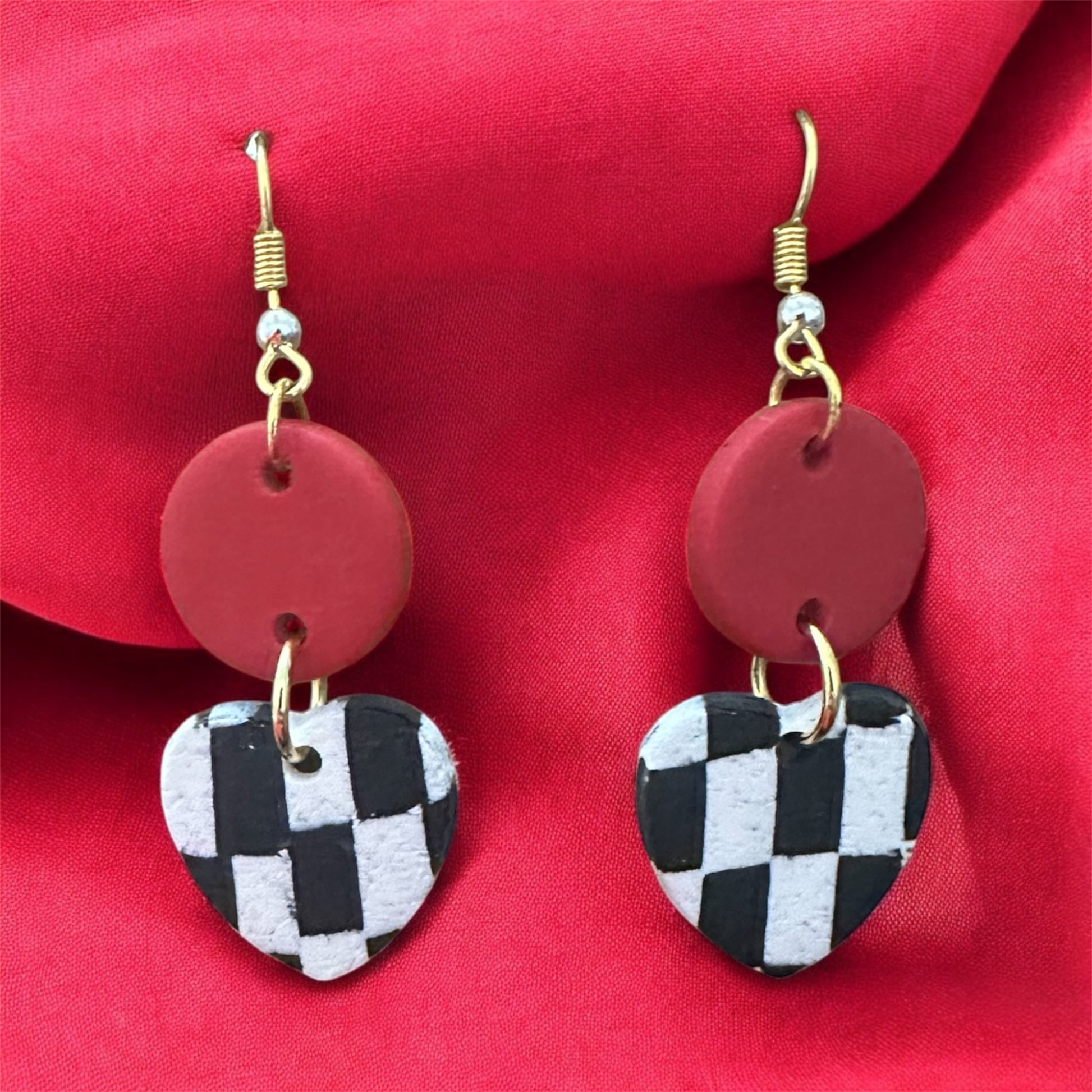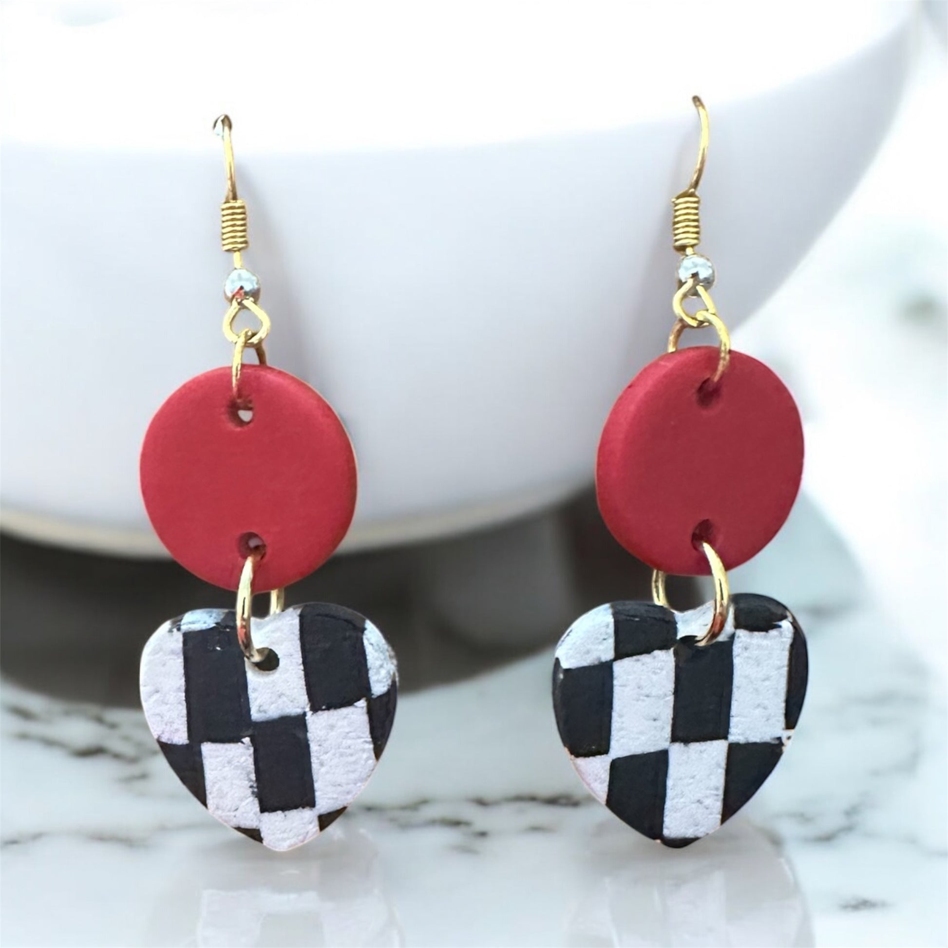 Featuring hand-sculpted timeless checkerboard hearts that nod to the final power play in chess, and bold matte red circle studs that bring the heat, these dangles are all about winning hearts and owning your space.
