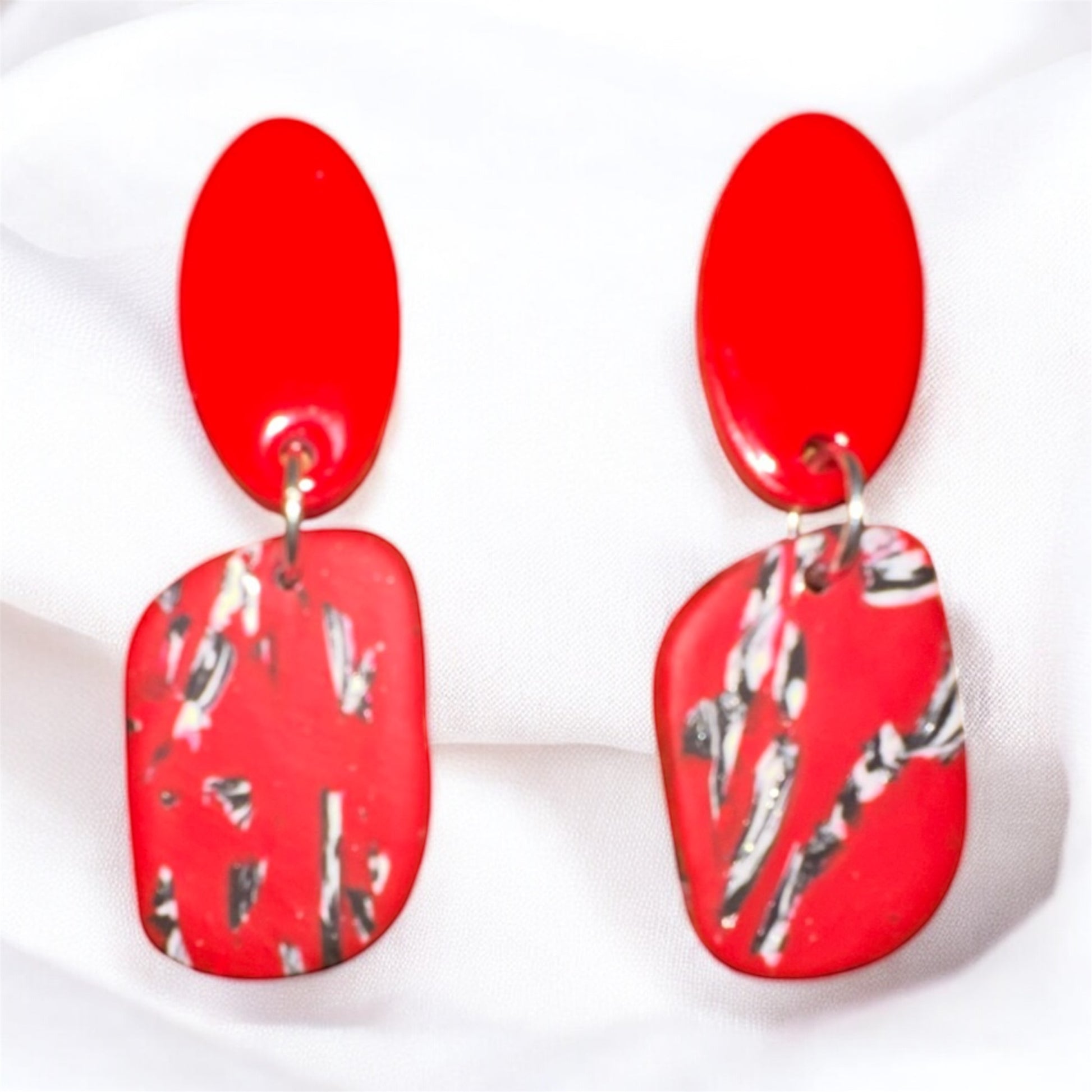The Crimson Ember Dangles radiate bold energy with their vibrant, glossy red tops and abstract marbled lower pieces streaked with black, white, and silver. The combination of smooth ovals and organic rectangular shapes creates a dynamic contrast, while the fiery palette evokes sparks in motion. Perfect for making a confident, artistic statement, these earrings add a touch of modern drama to any look.