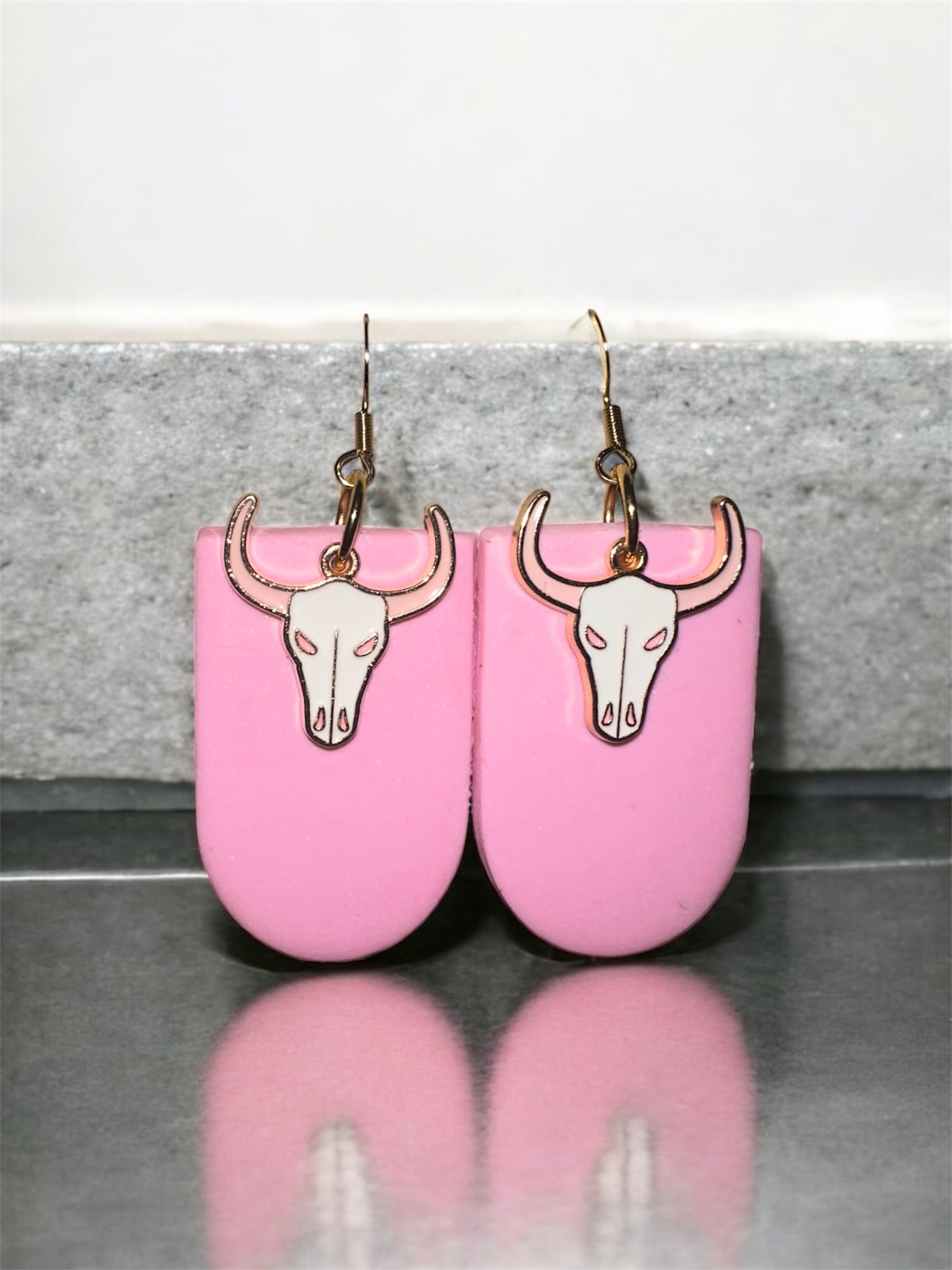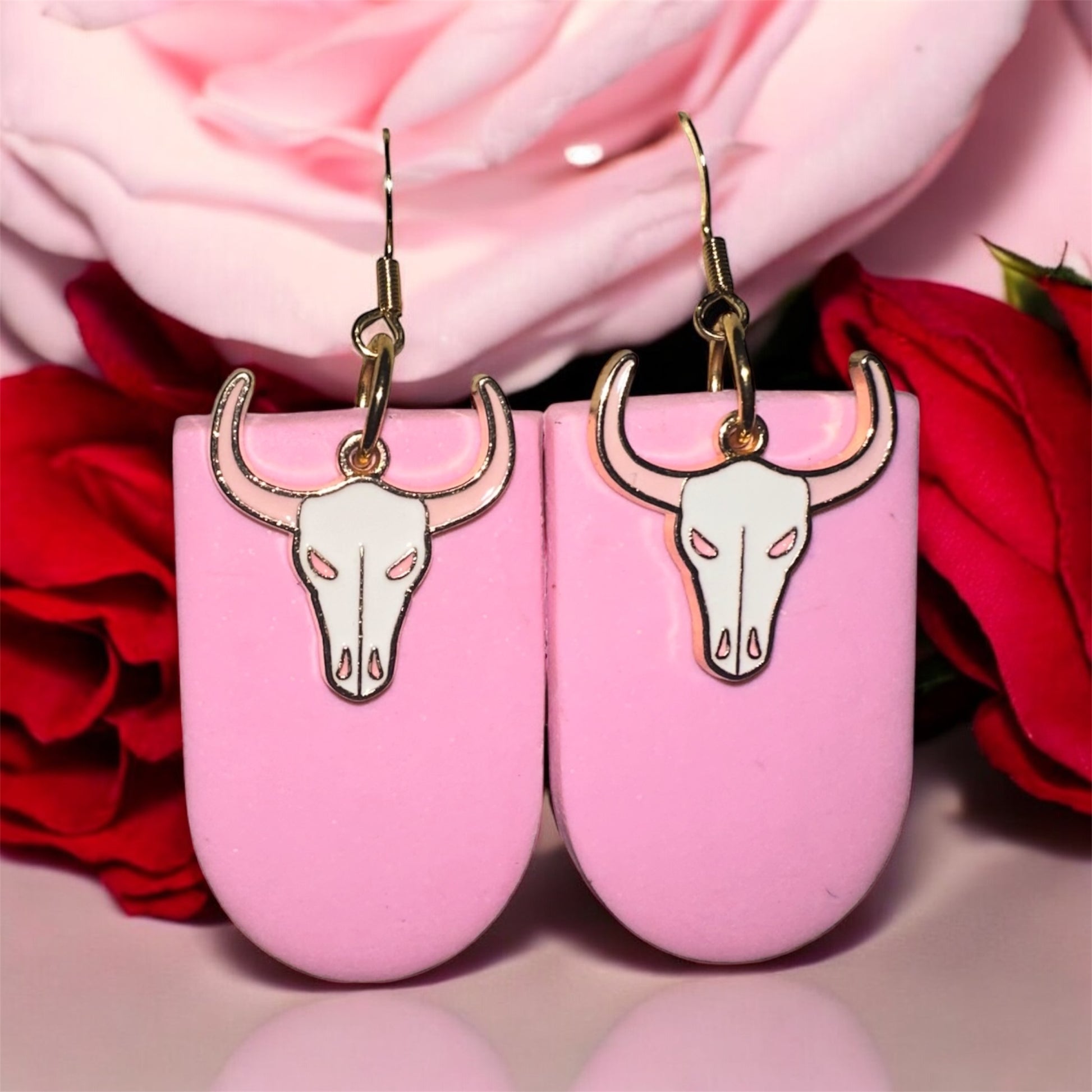Bold meets boho in these handcrafted polymer clay earrings, featuring a soft pink backdrop topped with sleek gold-outlined longhorn skull charms. The warm blush hue adds a playful twist to the rugged Western motif, making them the perfect statement piece for cowgirl-chic outfits or modern festival looks. Lightweight yet eye-catching, they blend rustic charm with a pop of feminine color.