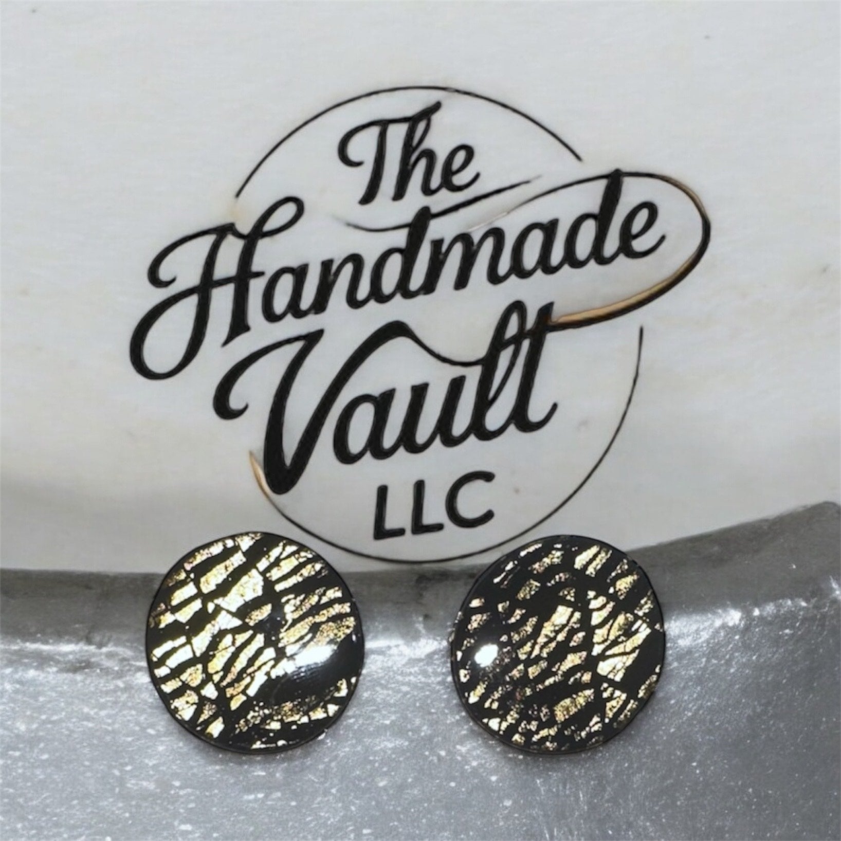 The Golden Roots Studs are a bold yet refined statement of power, identity, and ancestral pride. Featuring a deep black base adorned with radiant gold foil veining, these round studs evoke the strength and beauty of deeply rooted heritage, like golden roots breaking through dark soil.