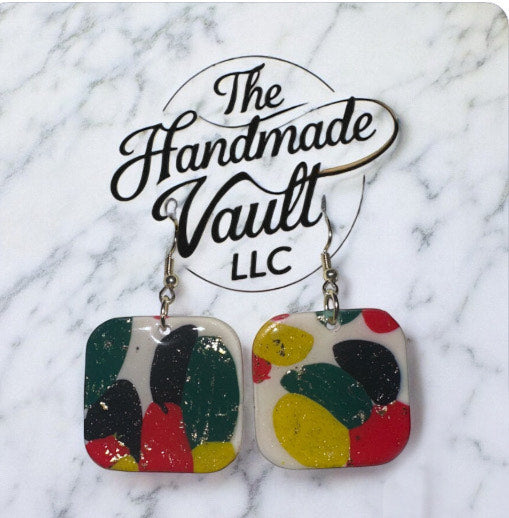 Celebrate culture in full color with the Heritage Mosaic Drops, a joyful blend of red, yellow, green, black, and white layered like brushstrokes on a canvas of pride. These rounded square earrings are sprinkled with gold accents, reflecting strength and unity. Lightweight and radiant, they bring a bold, modern edge to ancestral beauty. Perfect for honoring freedom, joy, and legacy with every wear.