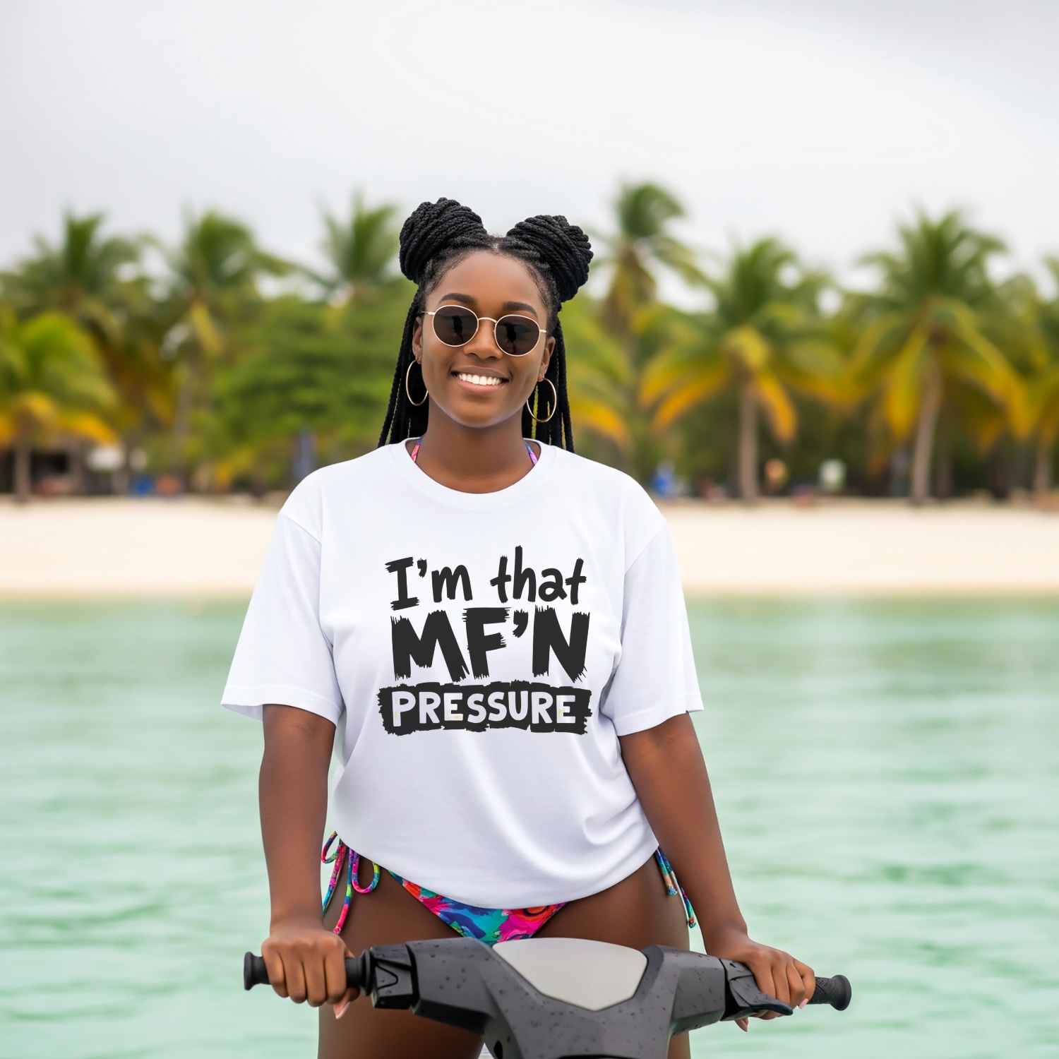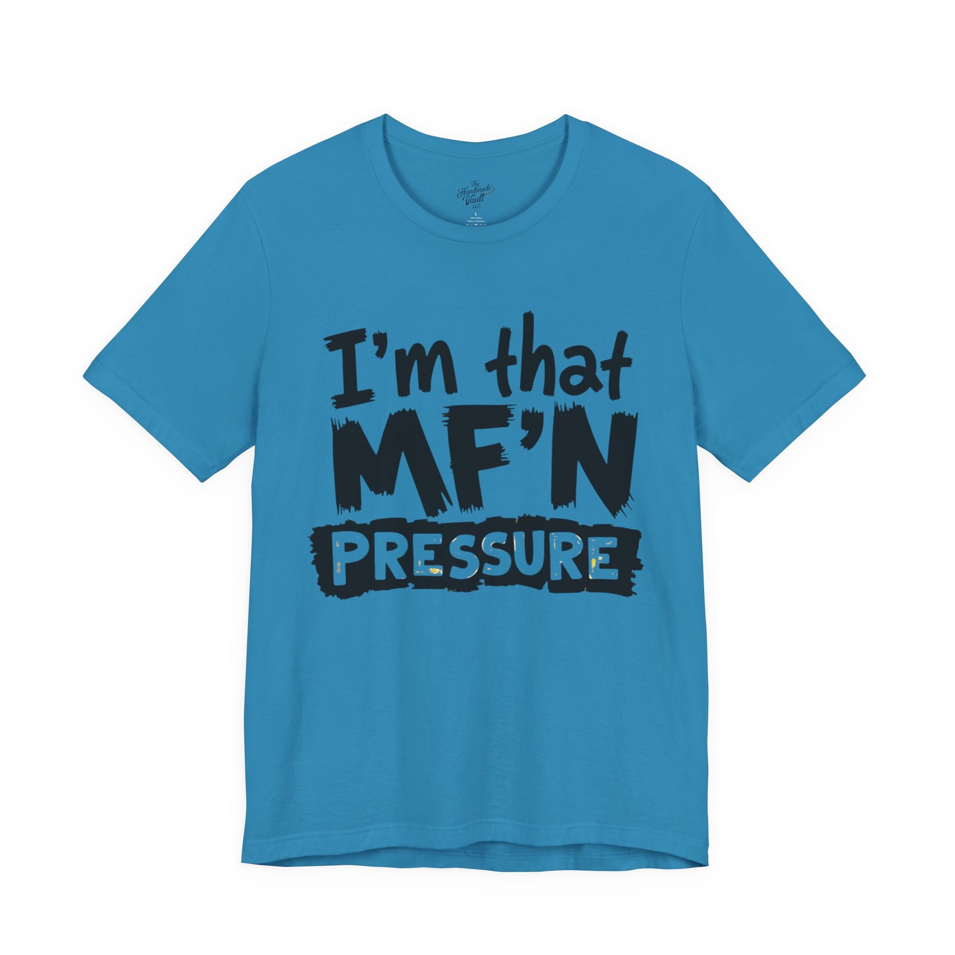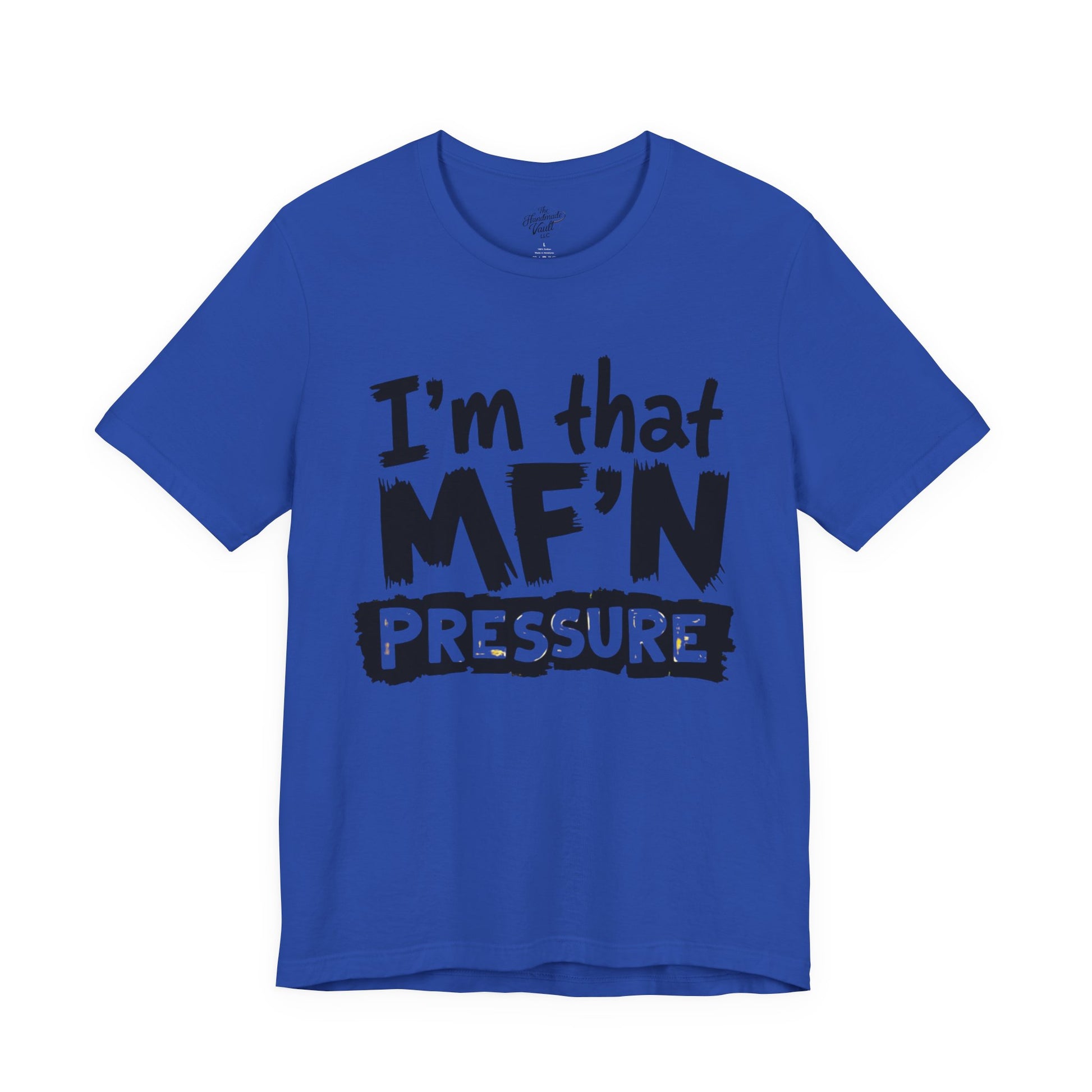 This I'm That MF'N Pressure Unisex Tee is a funny graphic shirt perfect for casual days or birthday party wear. It makes a great gift for friends with its everyday humor vibe. This tee is relevant to adults and is made with 100% lightweight cotton, ideal for active and leisure wear. The retail fit and crew neckline add a classic style that's perfect for accessorizing.