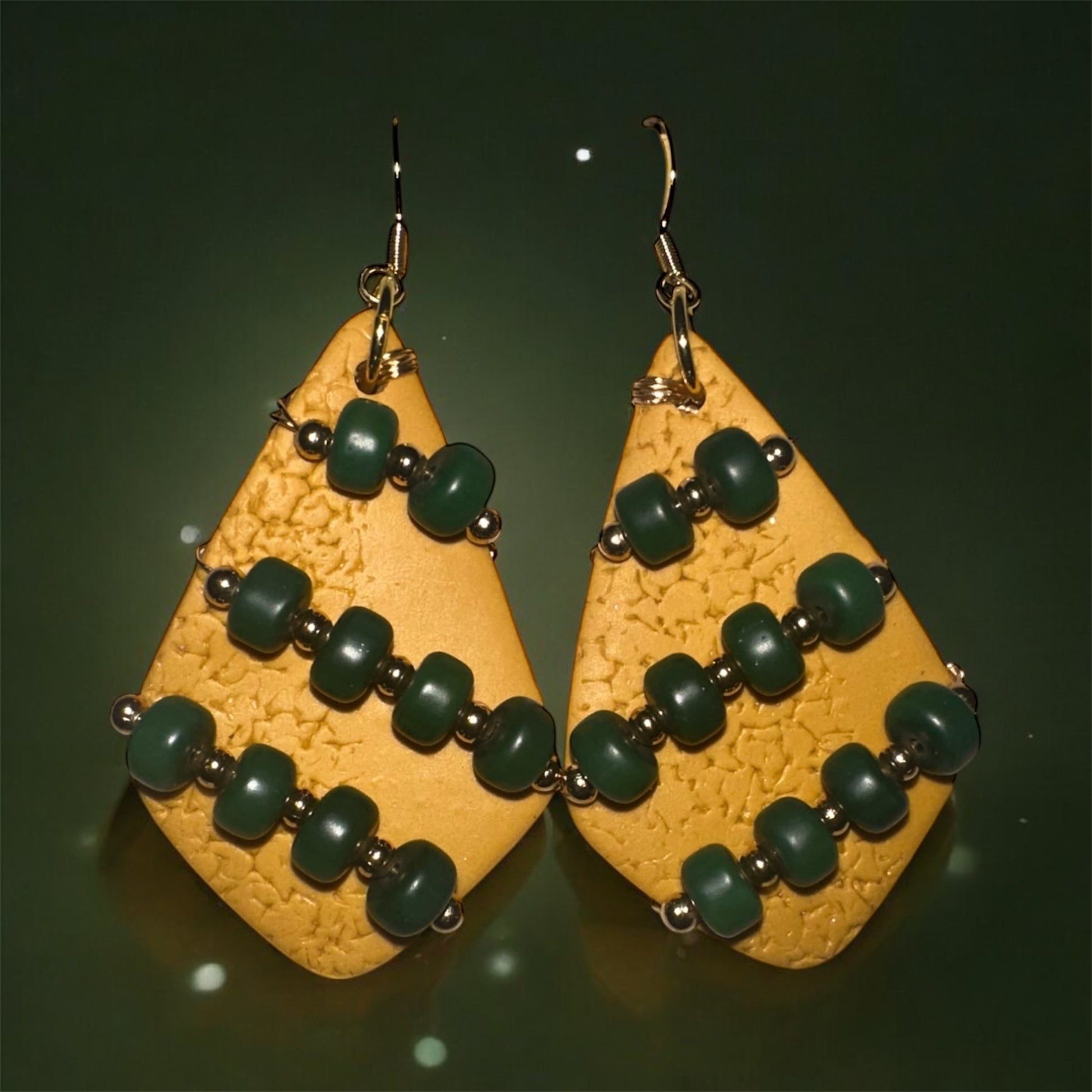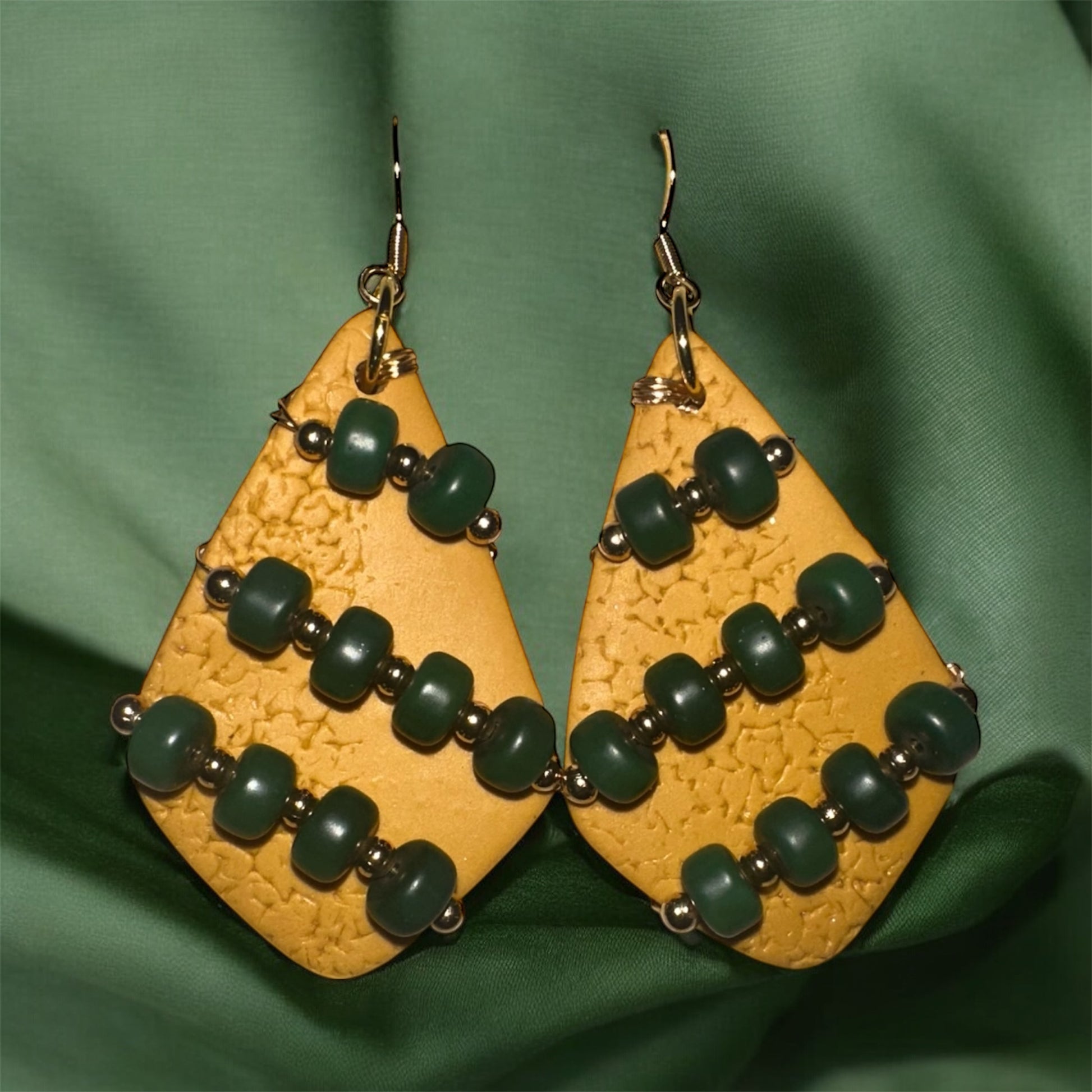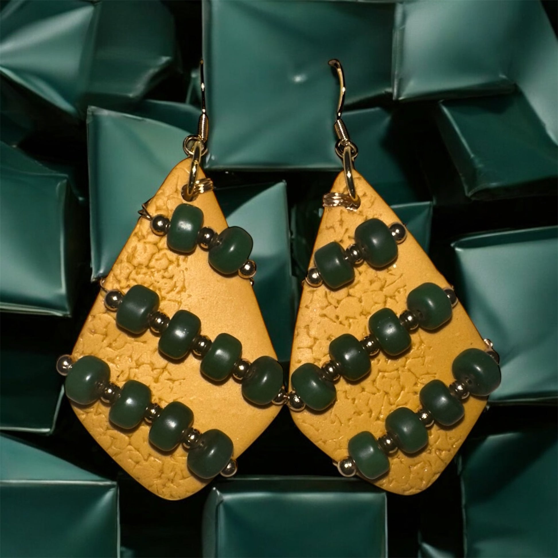 The Jungle Rhythm Drops earrings blend earthy textures and bold symmetry in a striking teardrop silhouette. Crafted from golden mustard polymer clay with an organic, textured finish, each piece is adorned with rows of deep forest green glass beads and metallic spacers. These earrings evoke the grounded vibrance of nature and the rhythmic balance of tribal-inspired design, making them a bold yet wearable statement for any season. Perfect for lovers of texture, tone, and handcrafted beauty.