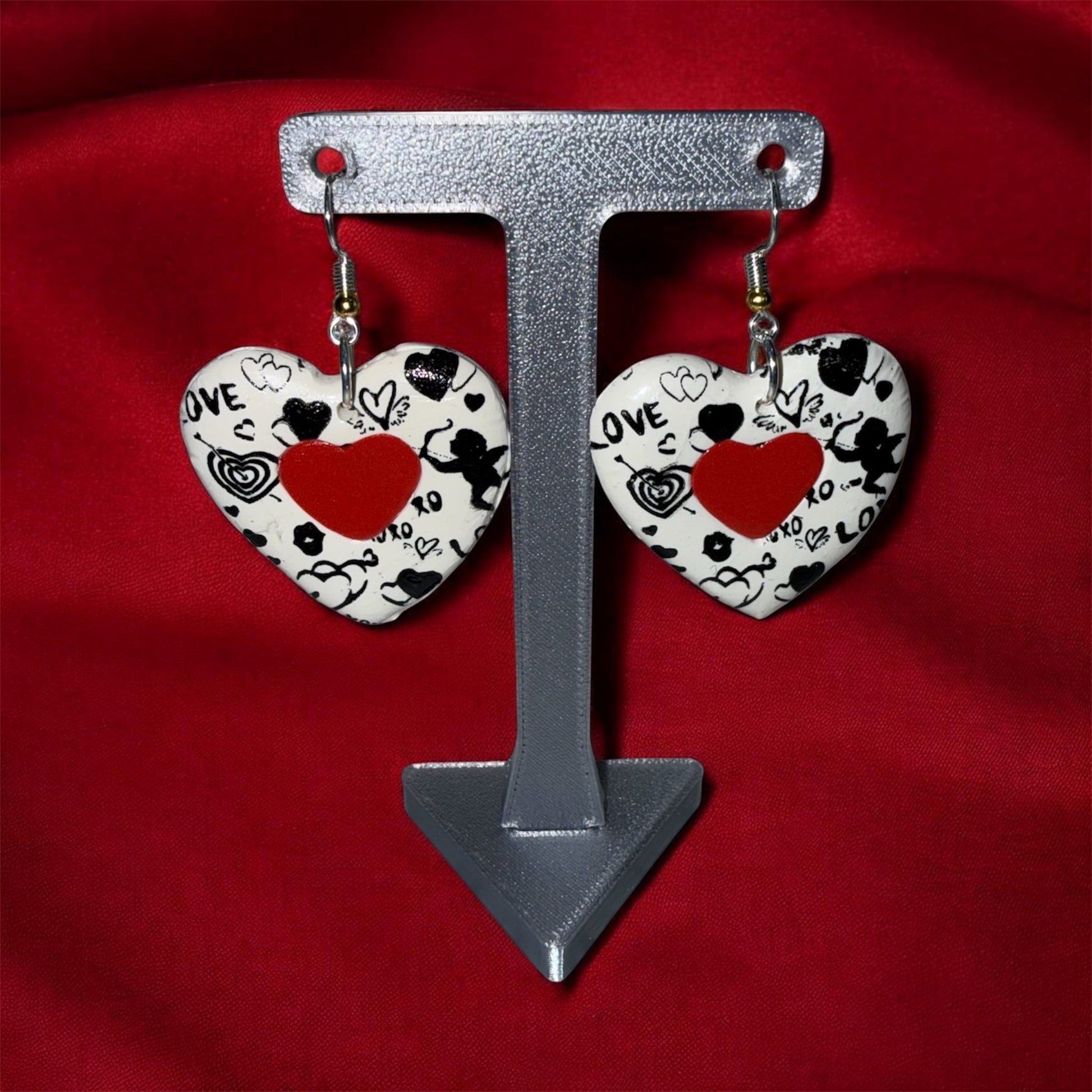 Graphic black-and-white hearts covered in playful love motifs bring art and romance together. Finished with a central red heart, this pair feels expressive, fun, and full of personality.