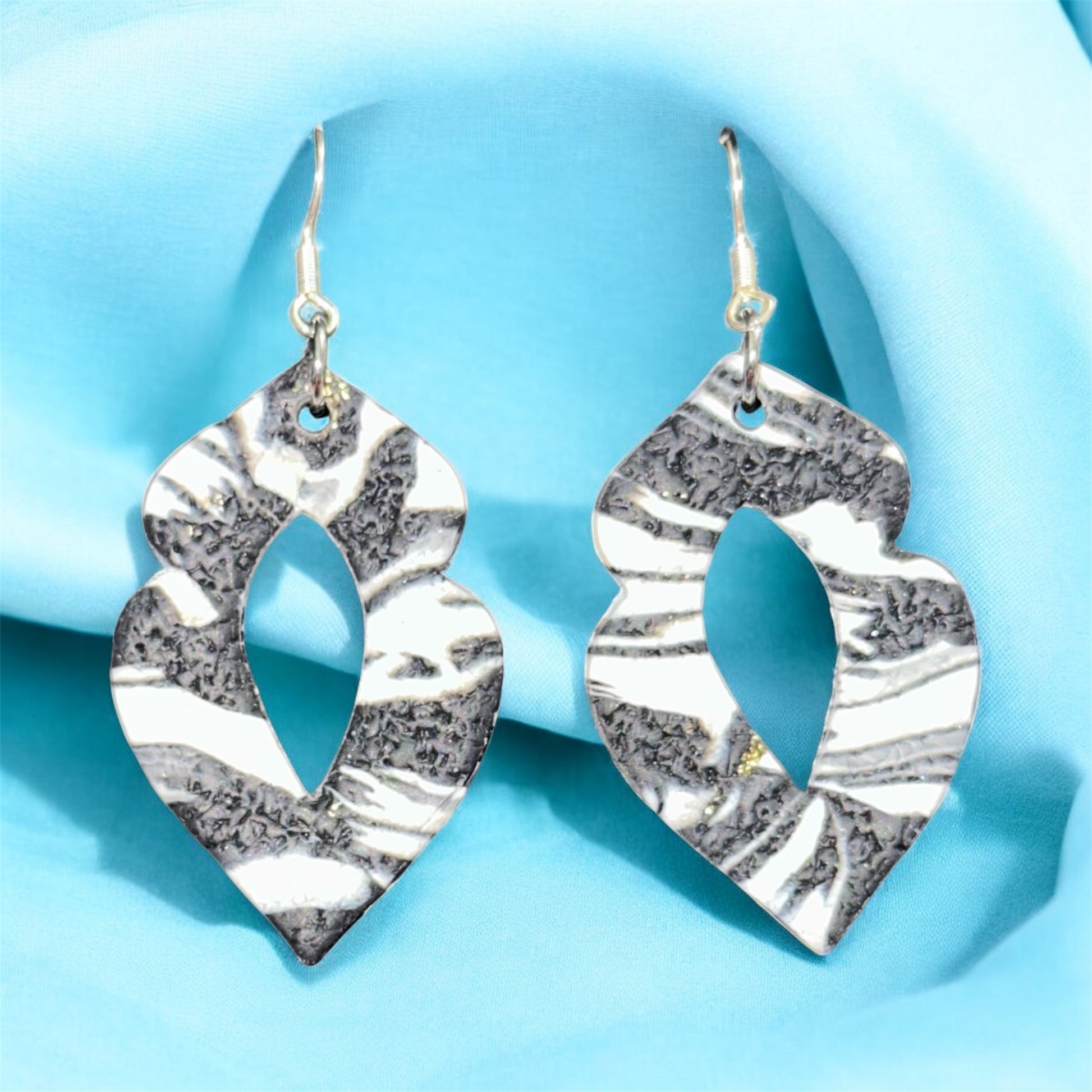 The Lunar Mirage Drops evoke the mysterious beauty of the moon’s ever-shifting surface. These earrings feature a striking abstract teardrop silhouette with a hollow center, formed from a marbled mix of cool white, smoky gray, and cosmic silver textures. The swirling pattern mimics the illusion of moonlight dancing on rippling water, while the bold cutout design adds a modern, sculptural edge. Lightweight and reflective, these polymer clay earrings are a dreamy choice for anyone drawn to celestial elegance and lunar-inspired fashion.