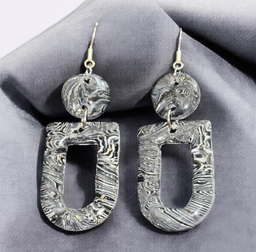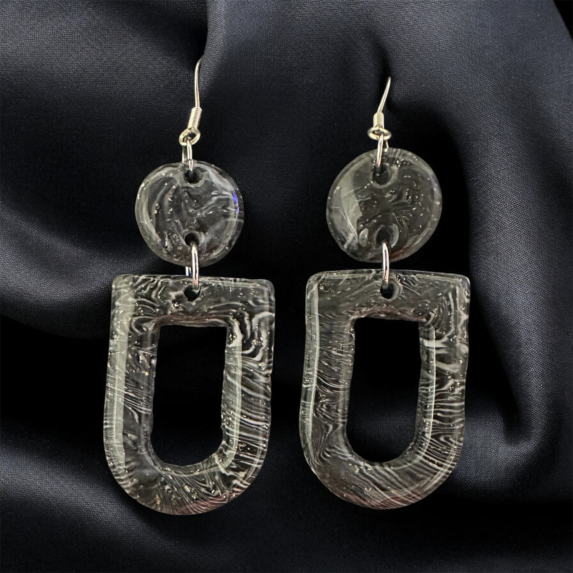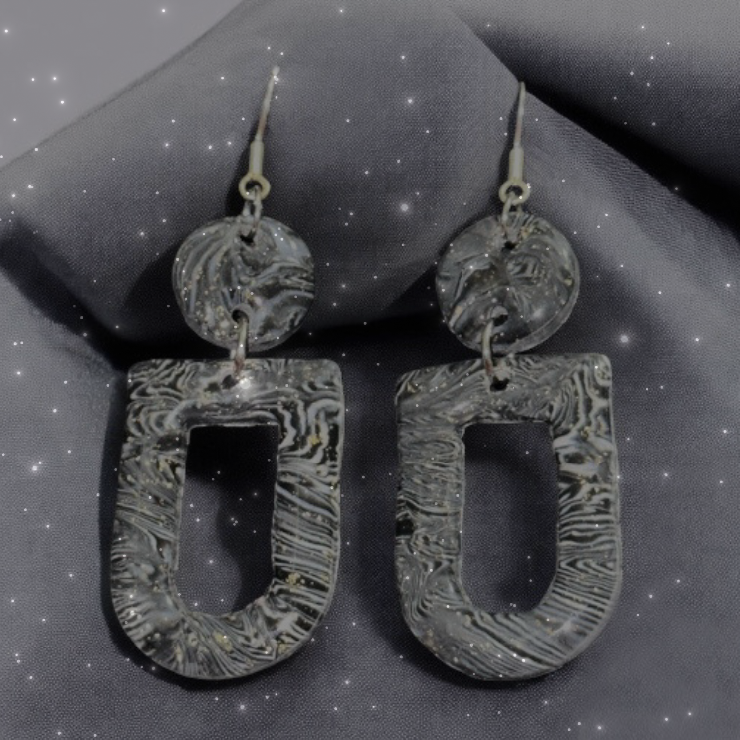 Inspired by the celestial dance of Mercury at its greatest elongation, these earrings capture the elegance of orbit and alignment. Mercury's Elongation earring features a stunning marbled blend of silvery grays and cosmic charcoal swirls, echoing the planet's shimmering presence in the early sky. The open-oval drop design evokes orbital paths and planetary movement, making these earrings a bold tribute to cosmic rhythm and celestial beauty. Lightweight and striking, they’re a perfect accessory for stargazers, astronomy lovers, or anyone drawn to the mysteries of the universe.