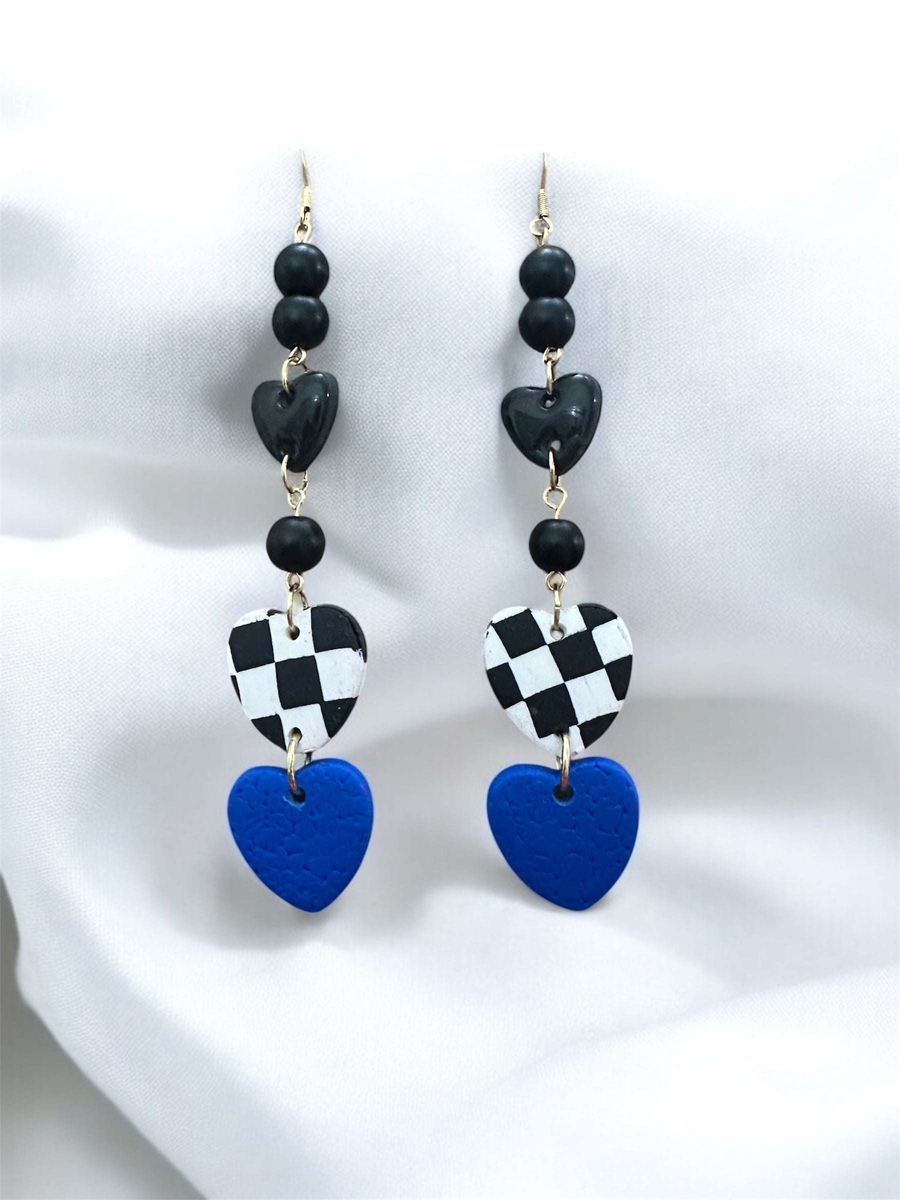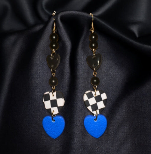 Drape your style in bold romance with the Midnight Racer Heart Drops earrings. Three tiers of hearts tell their own story, glossy black for mystery, a retro checkerboard for playful rebellion, and a pop of electric blue for fearless charm. Lightweight yet full of personality, these earrings are perfect for turning an ordinary outfit into a statement worth remembering.