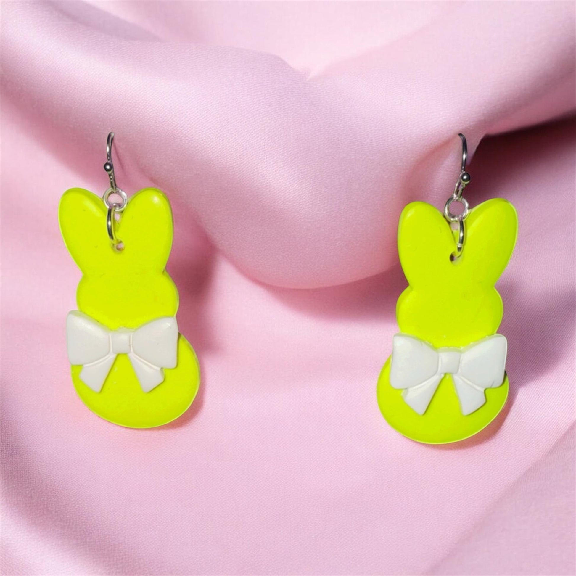 Bright, bold, and irresistibly sweet — the Neon Sugar Bunny brings a playful pop of color to your spring style. Featuring a vibrant neon yellow bunny silhouette paired with a soft, creamy bow, this design blends fun and femininity effortlessly. Set against a silky blush backdrop, these earrings give off a candy-coated, Easter-ready vibe that’s perfect for making a cheerful statement.