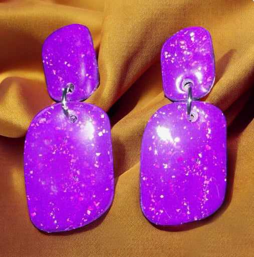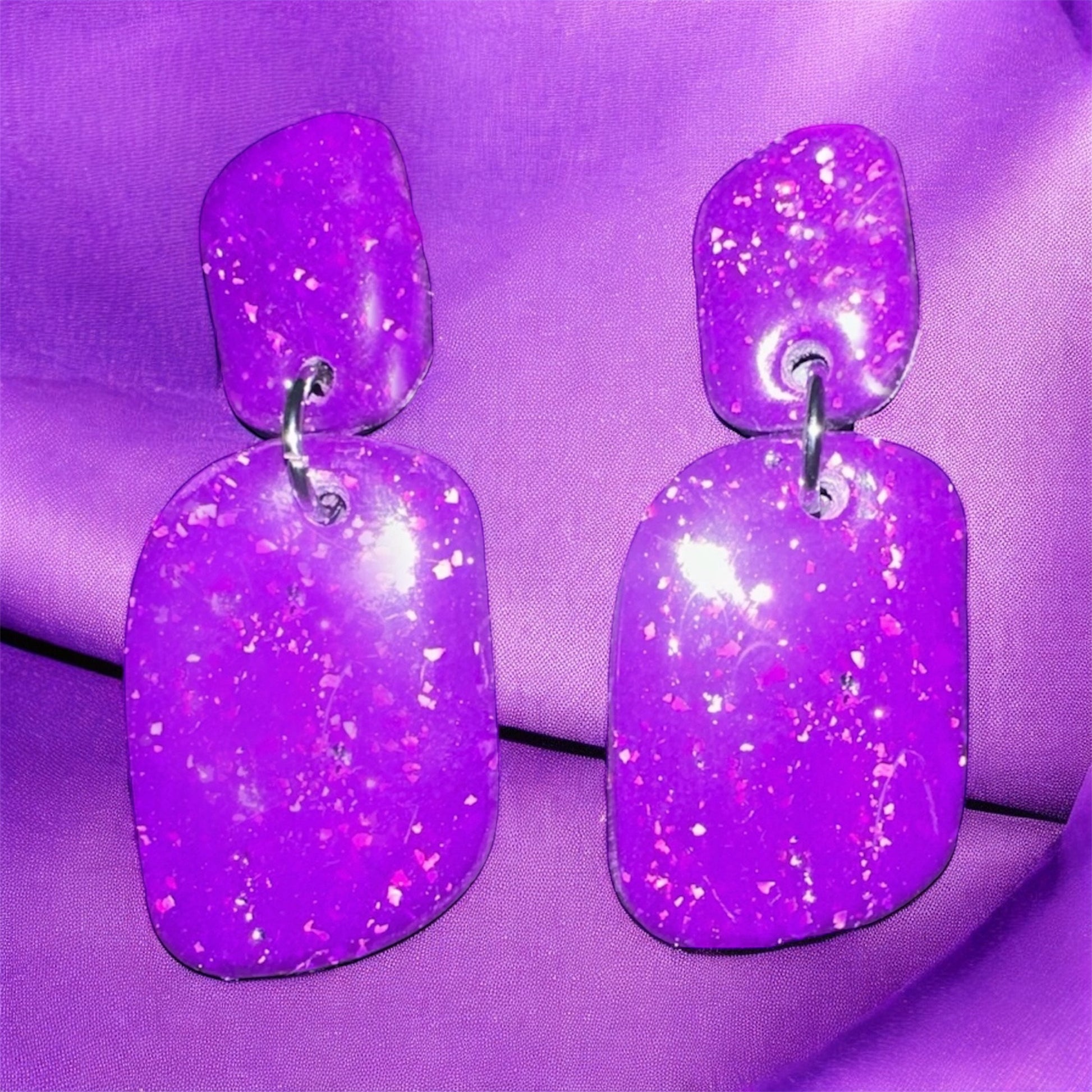Command attention with the Purple Reign Dangles, a bold and vibrant pair of polymer clay earrings designed for fearless expression. These glossy rectangular drops feature a cosmic blend of rich royal purple speckled with flecks of soft pink and white, giving them a galaxy-inspired shimmer. Their two-part structure adds movement and modern edge, perfect for graduations, celebrations, or everyday confidence. Lightweight, durable, and unapologetically regal—these earrings are for those who lead with style and grace.