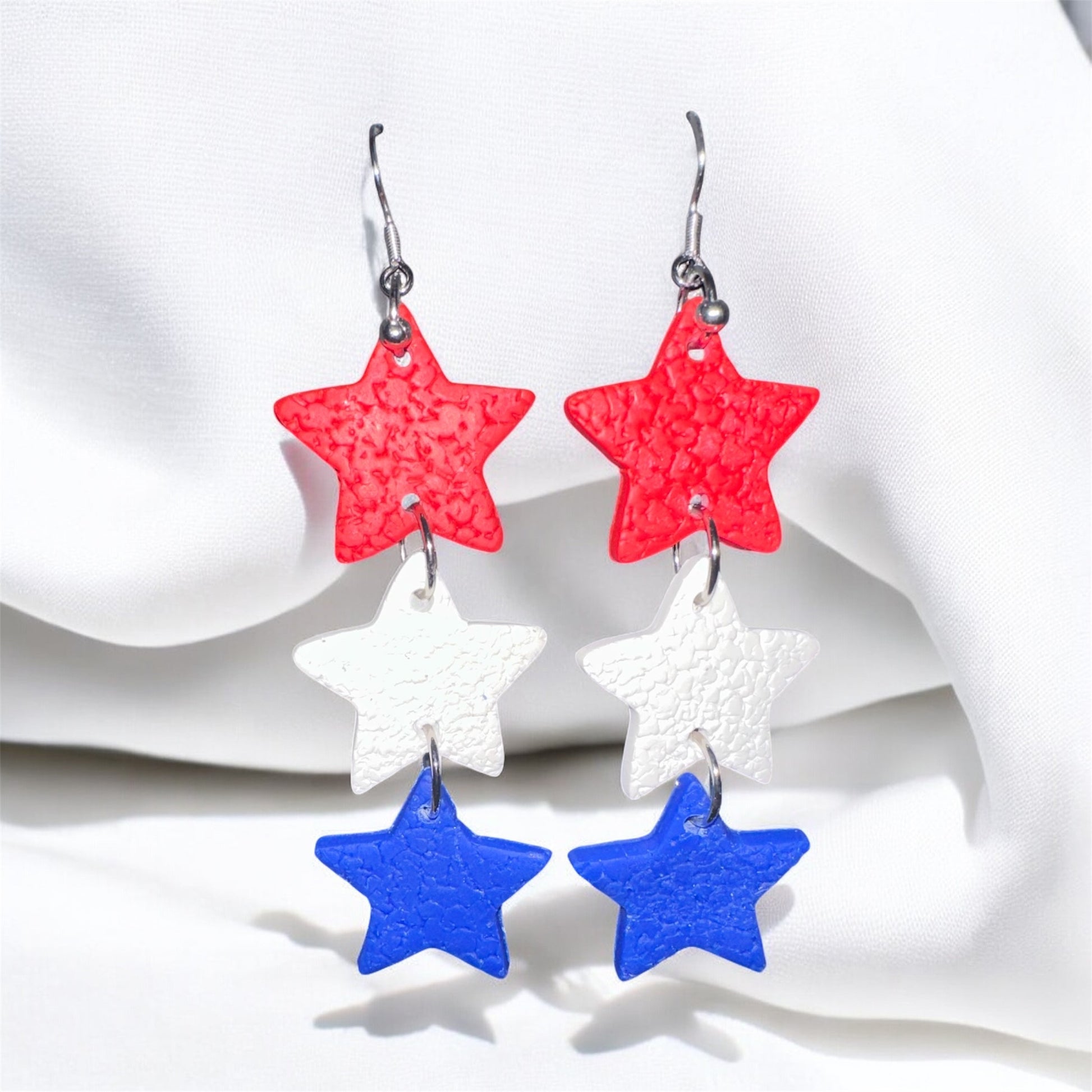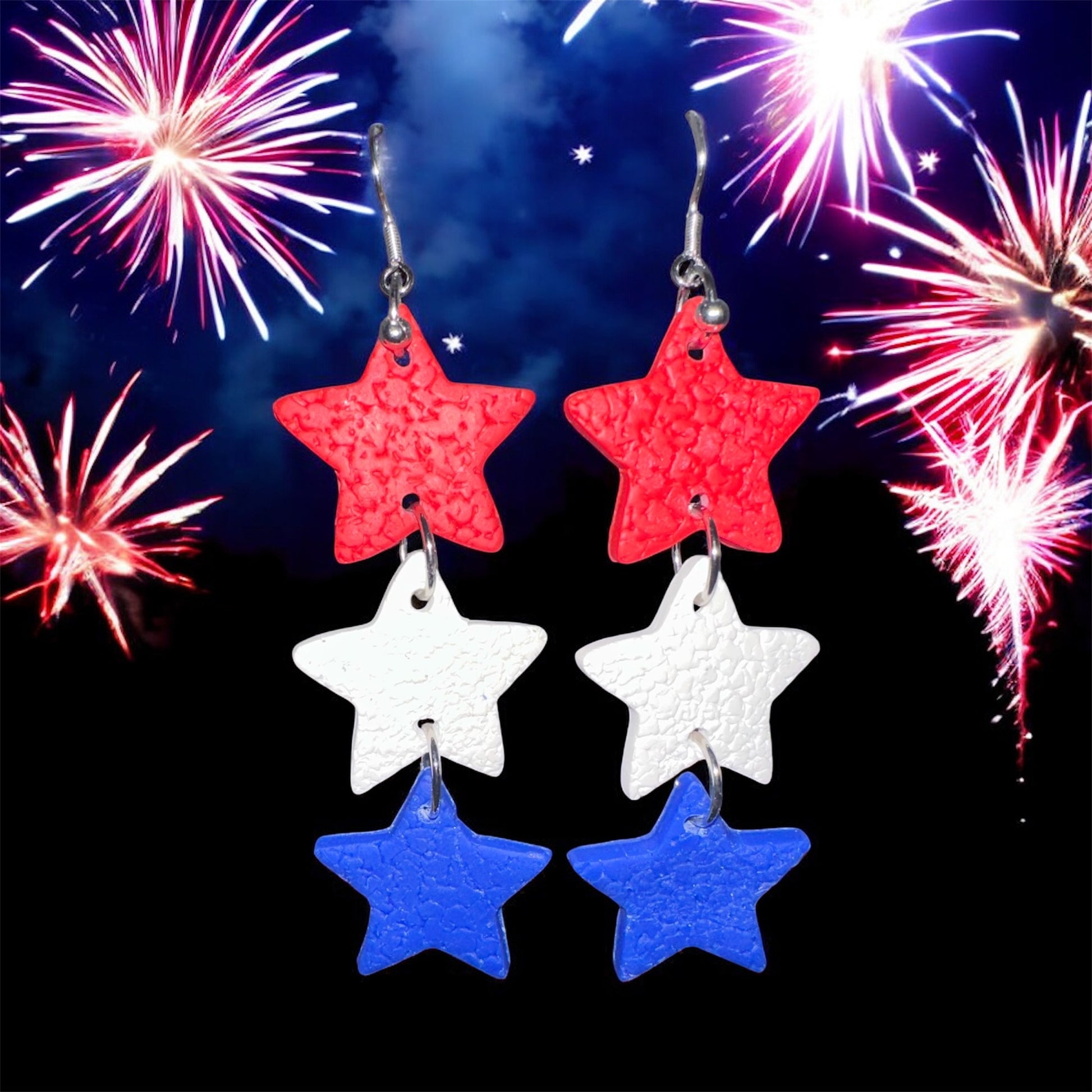 Celebrate in star-spangled style with the Star-Spangled Stack earrings, a bold and patriotic cascade of red, white, and blue stars! Each earring features three textured stars linked vertically, symbolizing unity and the American spirit. The vibrant colors and playful shape make these earrings the perfect accessory for parades, fireworks, BBQs, and any 4th of July celebration.