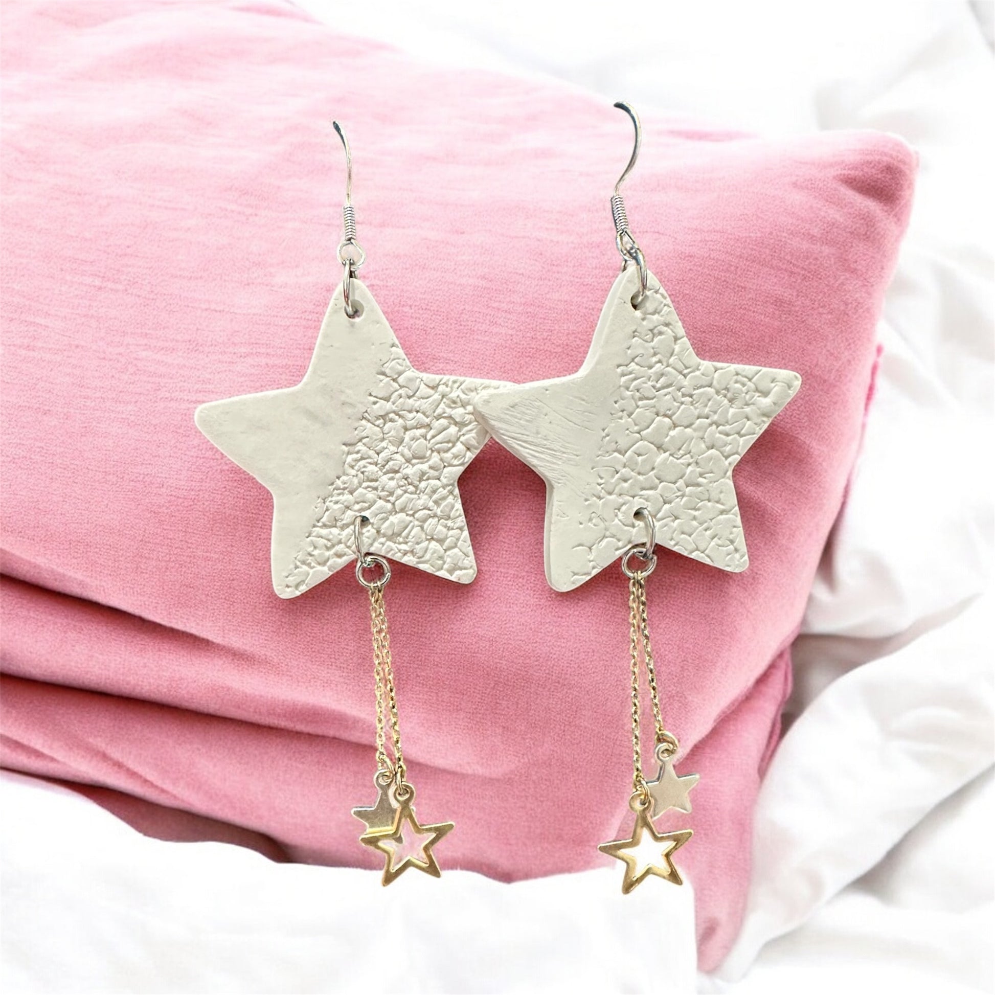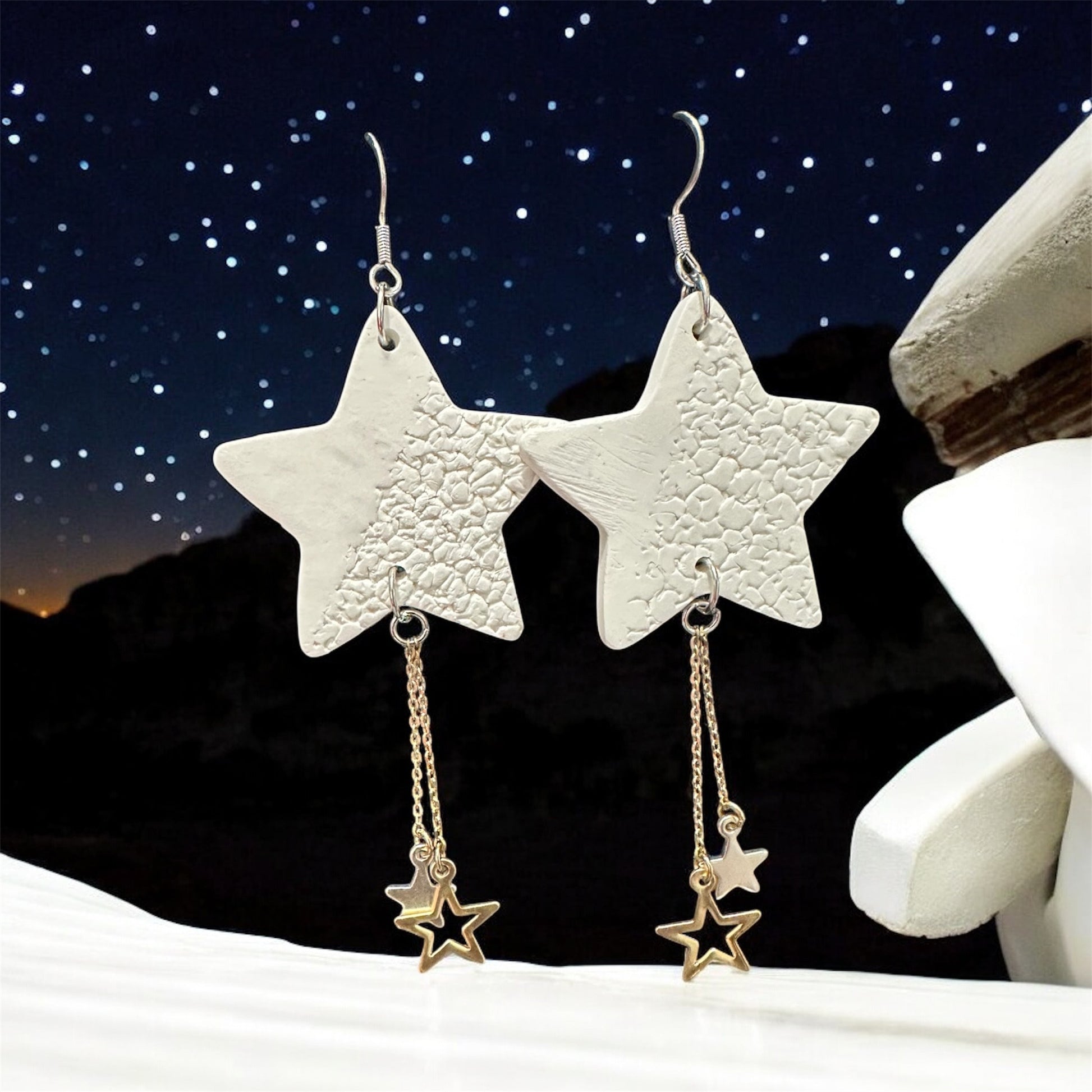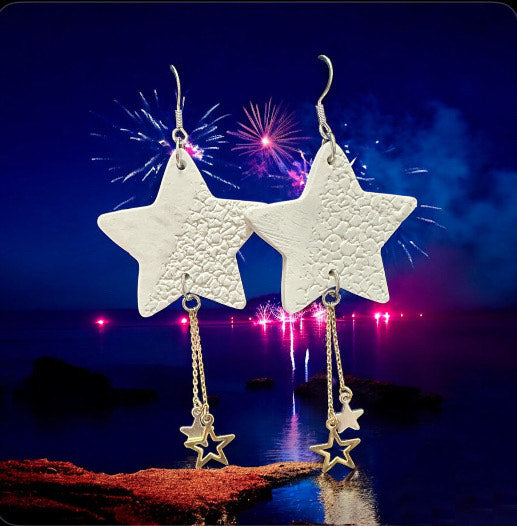 Celebrate Independence Day with Starlit Liberty a pair of earrings that captures the quiet strength of America under a night sky. These earrings feature textured white star pendants symbolizing unity and peace, with gold chain dangles that hold two star charms—one bold, one subtle—representing freedom and hope.