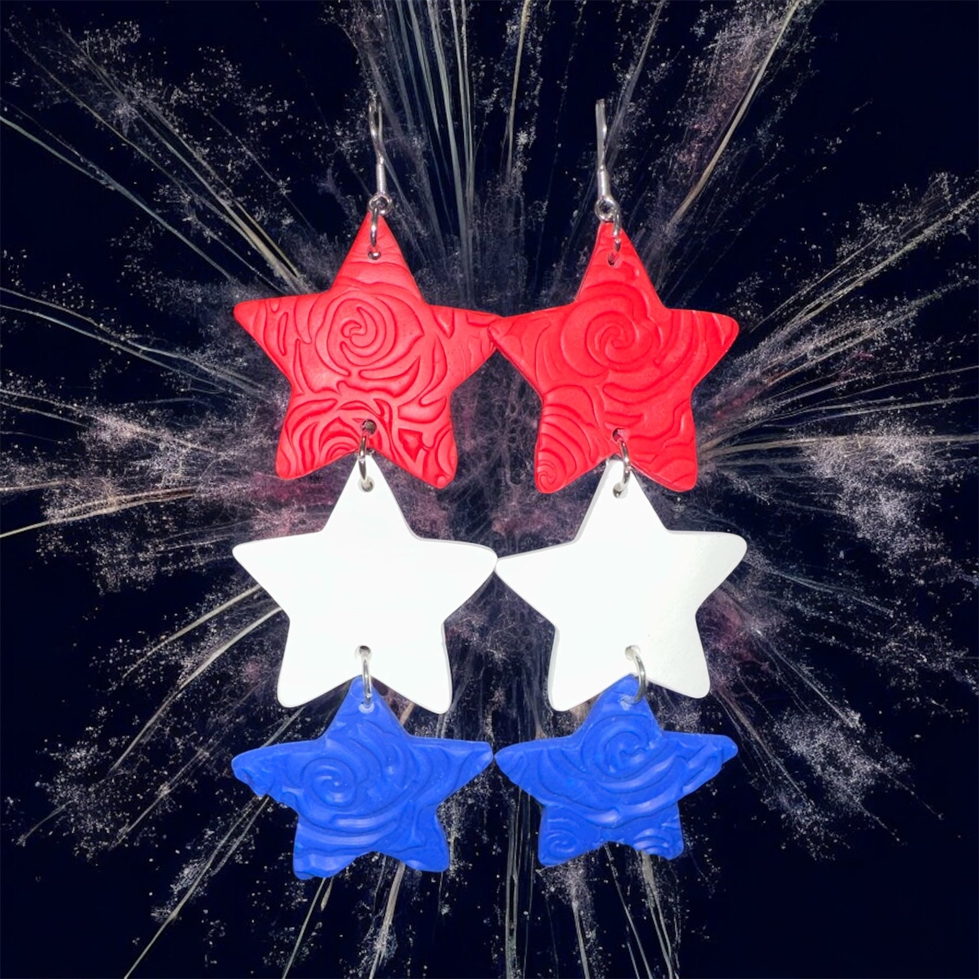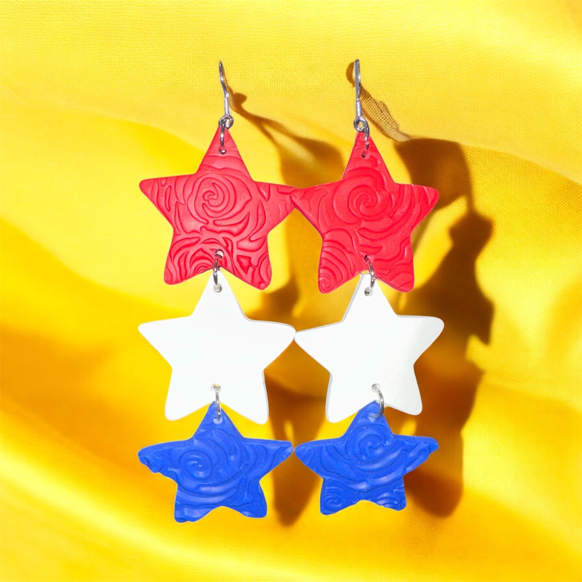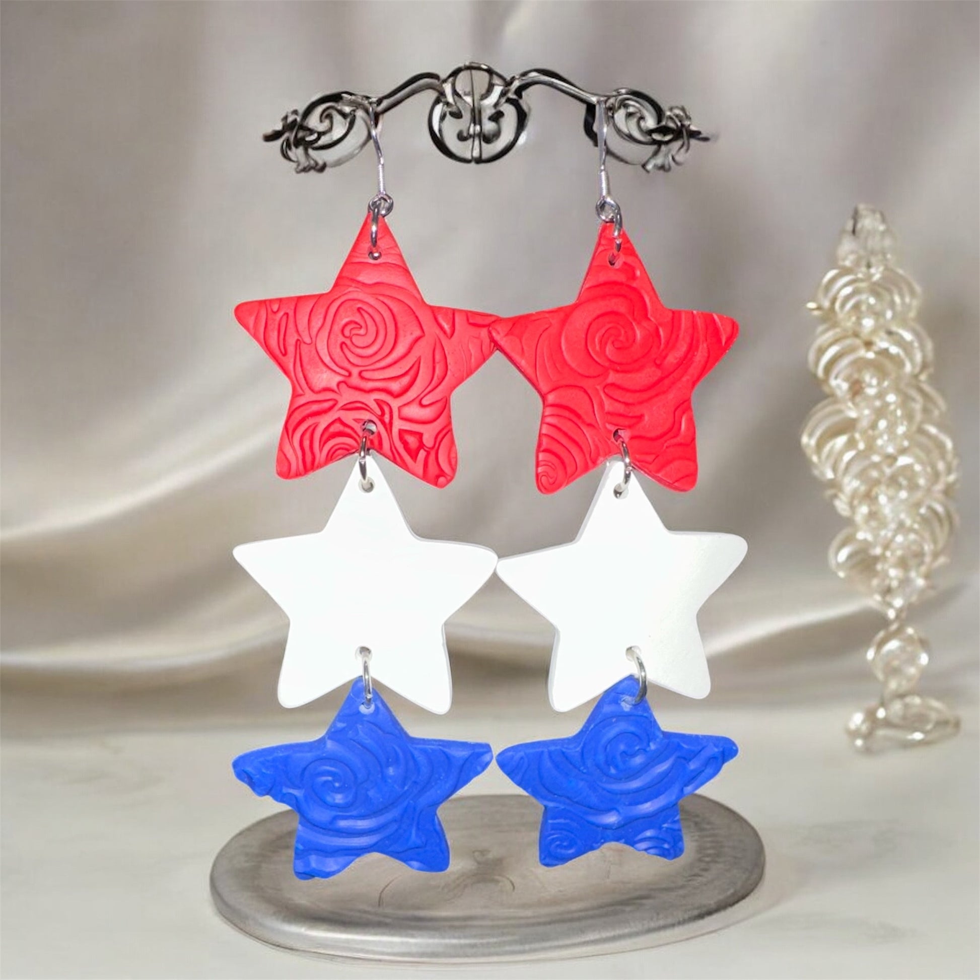 Celebrate freedom in full bloom with these striking red, white, and blue Stars & Petals earrings. Each earring features a trio of cascading stars, textured red stars at the top embossed with elegant floral swirls, smooth white stars in the center, and vivid blue stars at the bottom with matching embossed floral patterns. The layered design pays tribute to the American flag while adding a unique, handcrafted charm. Perfect for Fourth of July festivities, these earrings offer a bold and beautiful way to show your patriotic spirit with a touch of floral flair.