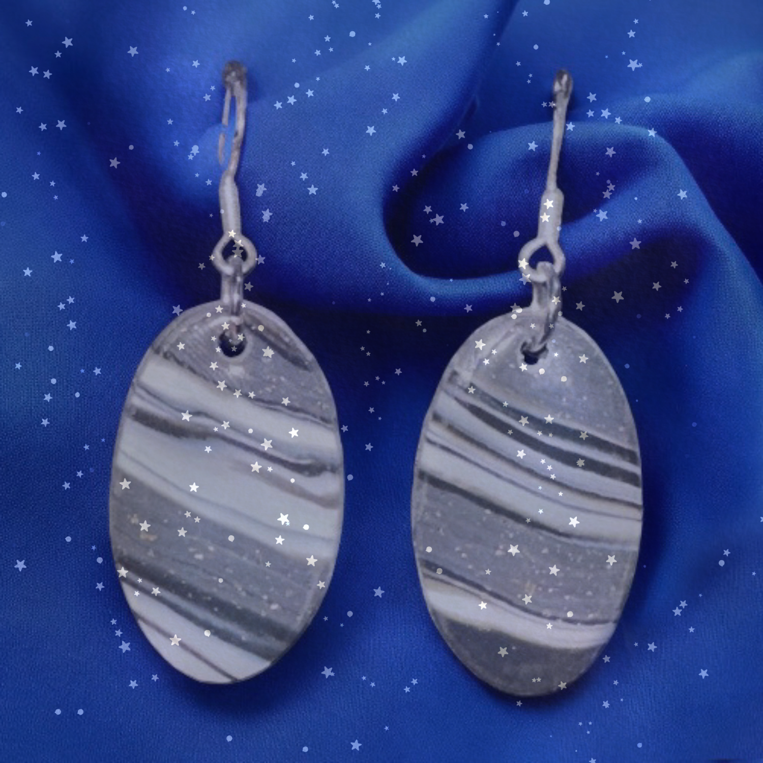 The Stellar Drift Earrings evoke the still beauty of moonlight rising above a quiet planetary surface. Their smooth oval shape is adorned with flowing layers of white, silver, and charcoal gray, mimicking the gentle striations of lunar landscapes seen at dawn. Subtle specks of shimmer are scattered throughout the polymer clay, giving the illusion of distant stars peeking through a soft celestial glow. Lightweight yet eye-catching, these earrings are perfect for lovers of space-inspired fashion and minimalist elegance.