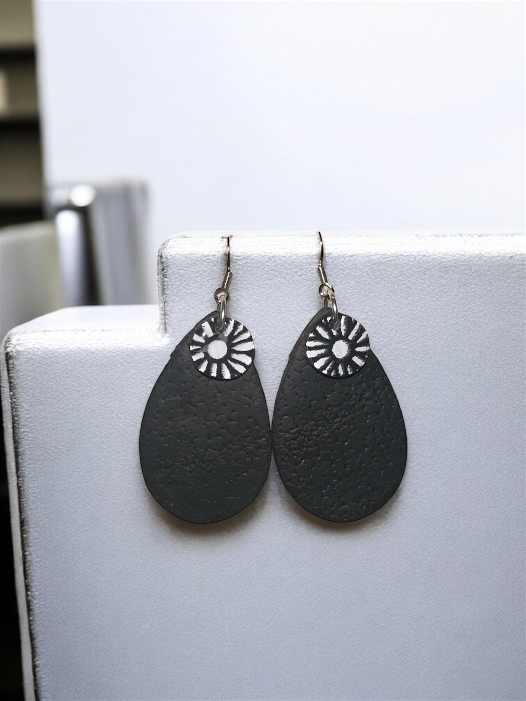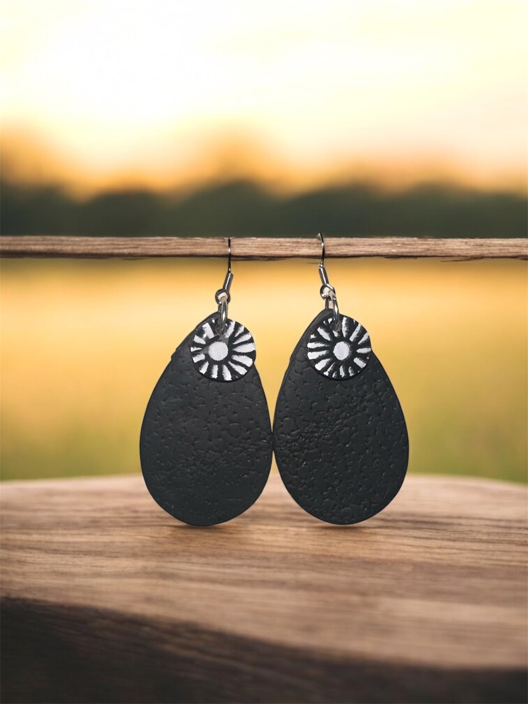 The Sunset Echo earrings are a bold blend of natural texture and elemental elegance. Featuring matte black teardrop-shaped polymer clay with a subtle, pebbled surface, each piece is topped with a charming center daisy accent, adding a touch of softness and nature-inspired beauty. The contrast between the dark base and delicate floral detailing creates a modern yet grounded aesthetic, perfect for everyday wear or moonlit evenings.