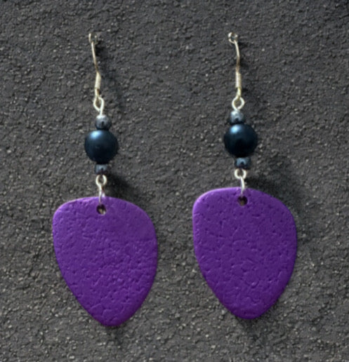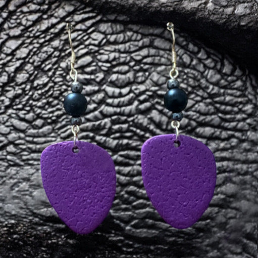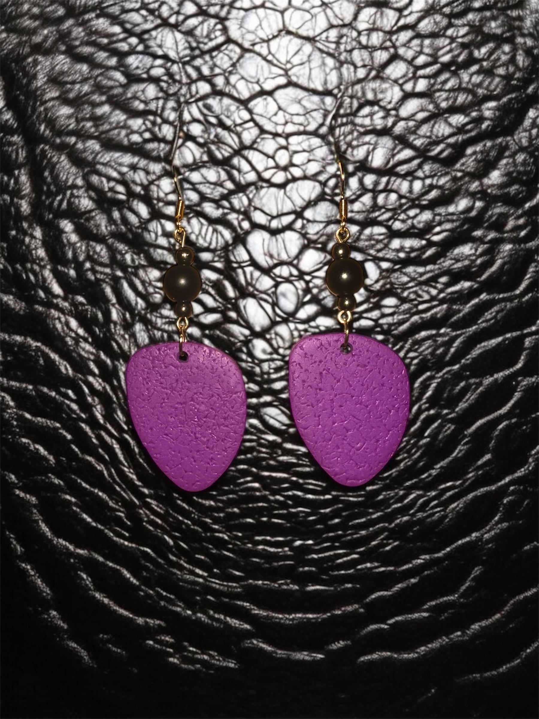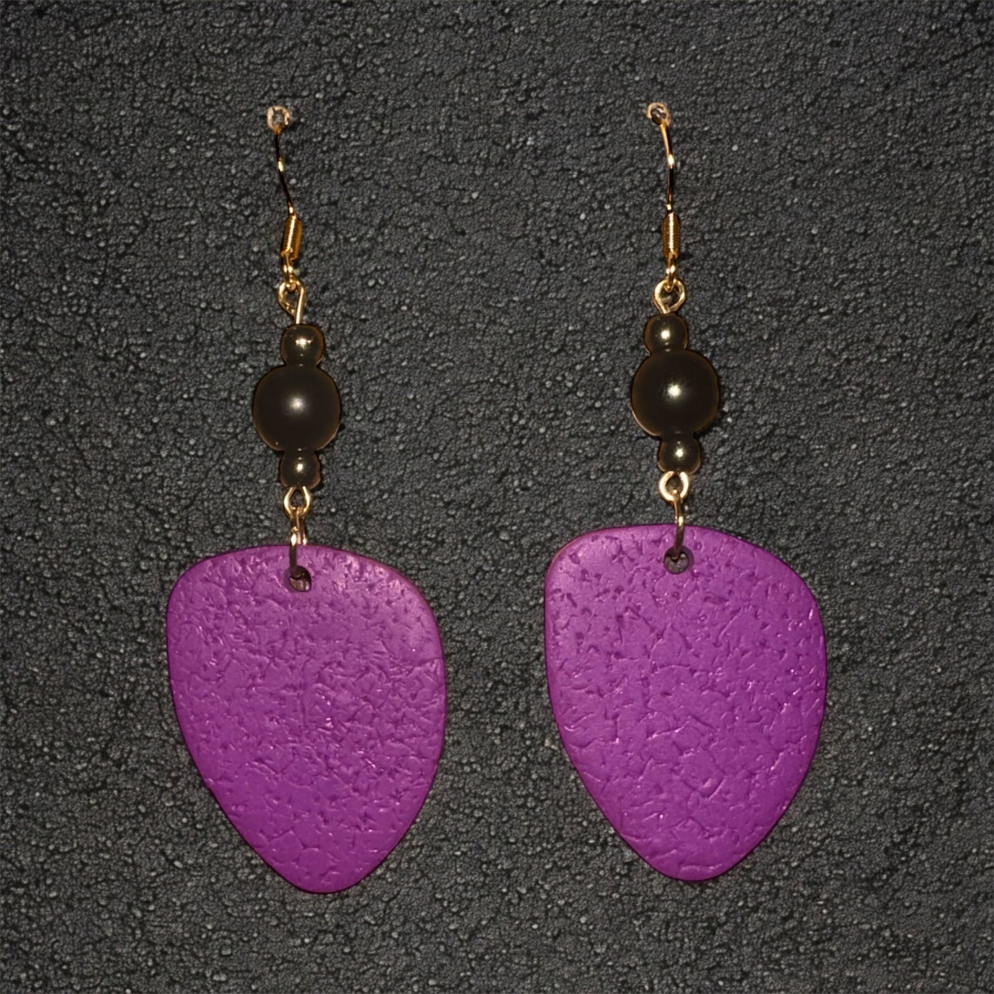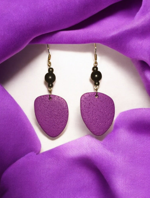 These striking dangle earrings feature bold, guitar-pick–shaped pendants in a rich, textured amethyst purple, paired with smooth, deep-black round beads for a sophisticated contrast. The subtle shimmer of the gold-tone hooks adds a touch of warmth, making them perfect for adding a pop of color and elegance to both casual and evening outfits.