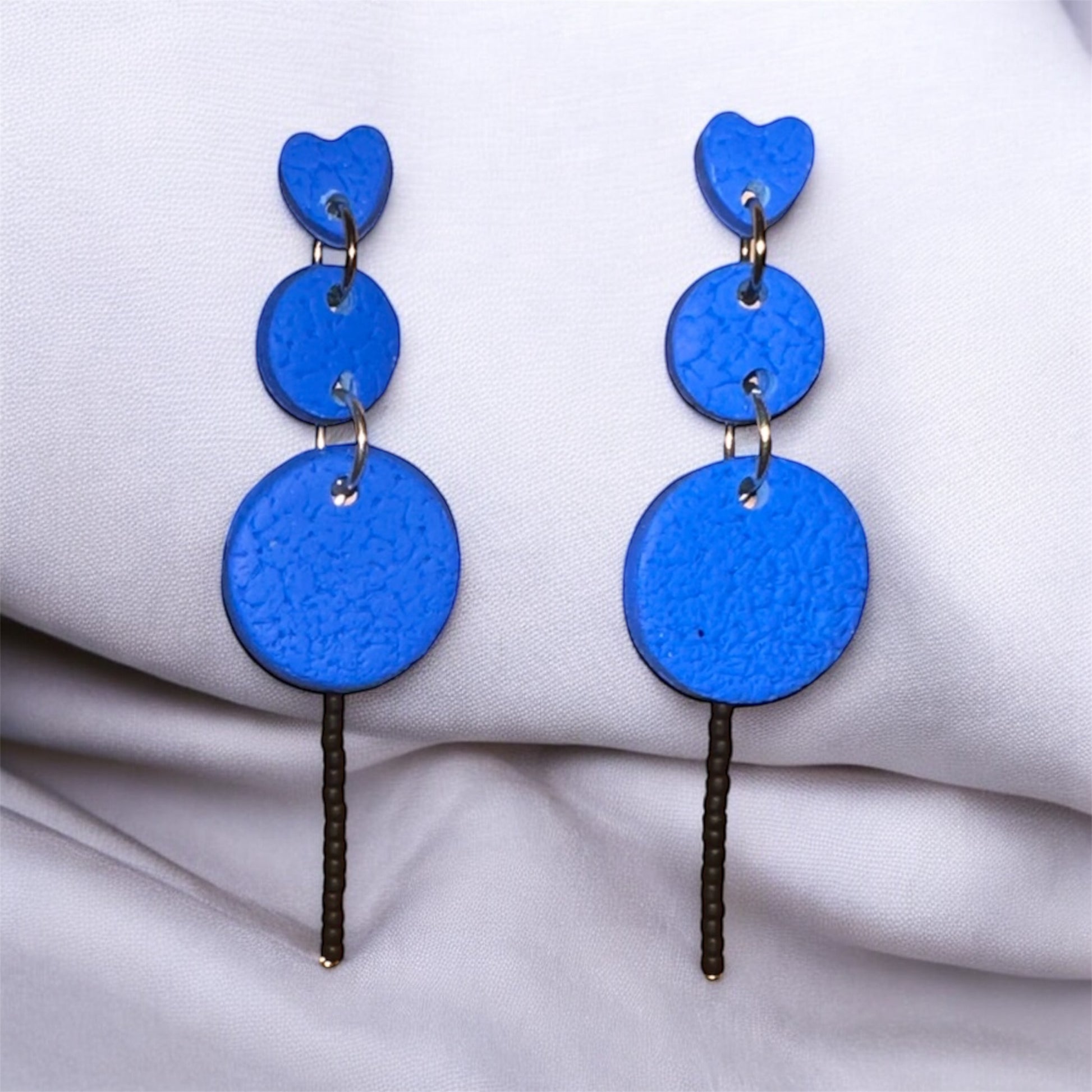 Make a bold statement with the Bead & Beat Heartline Earrings, where playful geometry meets modern design. Featuring a vibrant cascade of cobalt blue shapes, these earrings start with a delicate heart stud, followed by two descending circles, each linked with sleek metal rings for subtle movement and shine. The textured finish on each shape adds depth and character, while the slender black beaded drop at the back adds an unexpected edge.