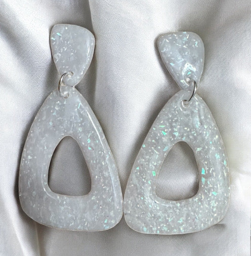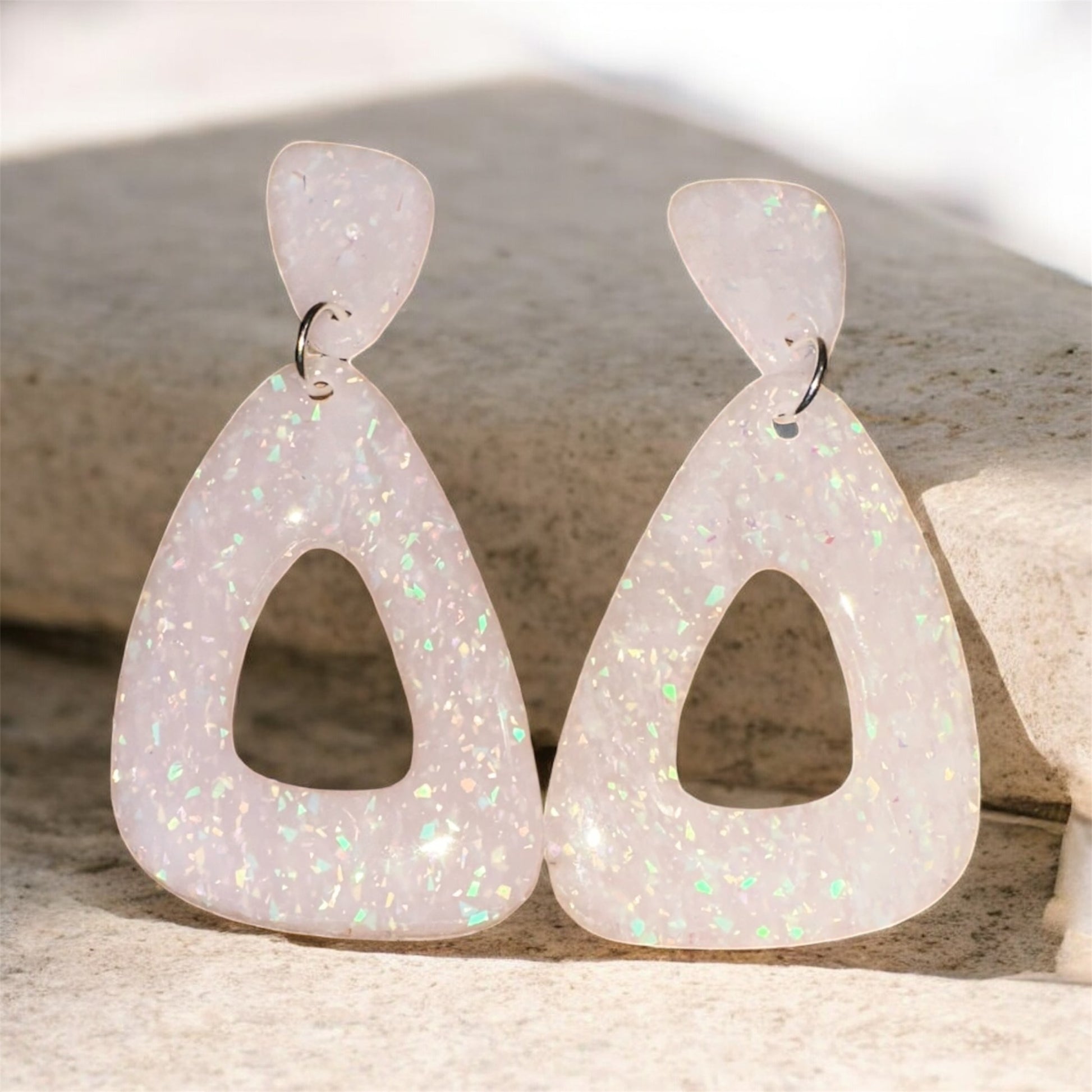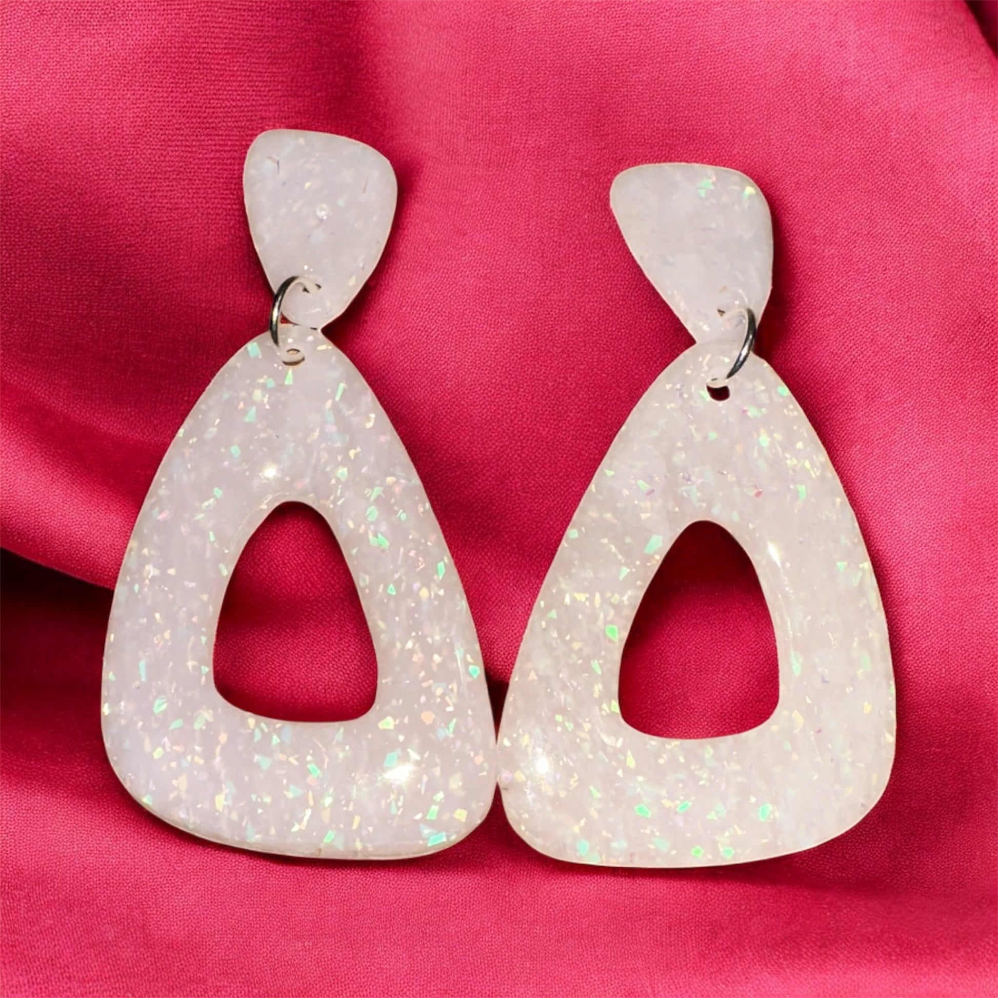 These statement earrings feature a modern geometric drop design in shimmering frosted resin. Their translucent white base is sprinkled with subtle iridescent flakes, catching the light with a pearlescent glow. Lightweight yet bold, the triangular cut-out shape adds a contemporary edge, making them perfect for both elegant evenings and chic everyday wear.