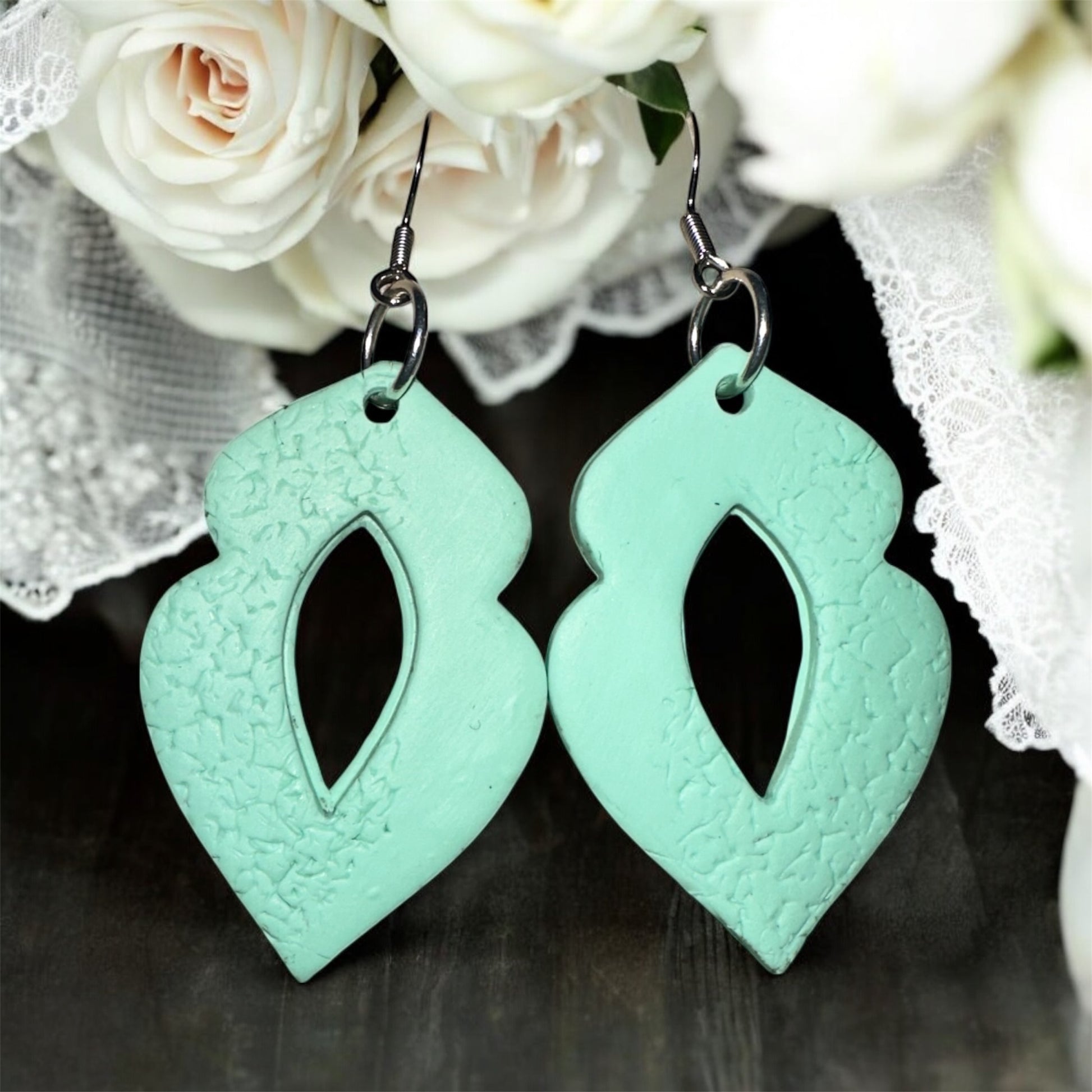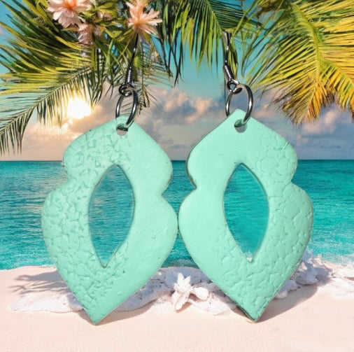 These handcrafted polymer clay earrings feature a graceful petal-like shape in a refreshing seafoam green. The center boasts an elongated diamond cutout, adding lightness and movement to the design. A subtle textured pattern along one side creates a beautiful contrast with the smooth finish, giving them a unique artisanal touch. Lightweight and versatile, they’re perfect for adding a fresh pop of color to any outfit, from casual days to special occasions.