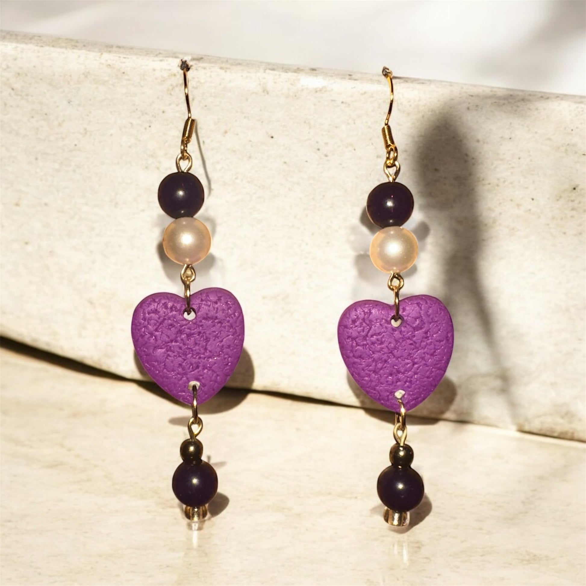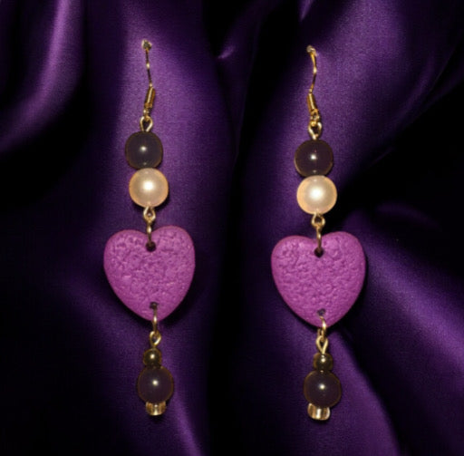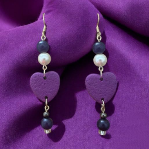 Delicate with a touch of drama, Violet Heartstrings earrings are a romantic statement for any occasion. These handcrafted dangle earrings feature rich purple heart-shaped charms at the center, beautifully accented with a mix of pearl-like and deep plum beads above and below. The blend of textures—smooth beads, soft matte hearts, and metallic details—creates a balanced and graceful silhouette.