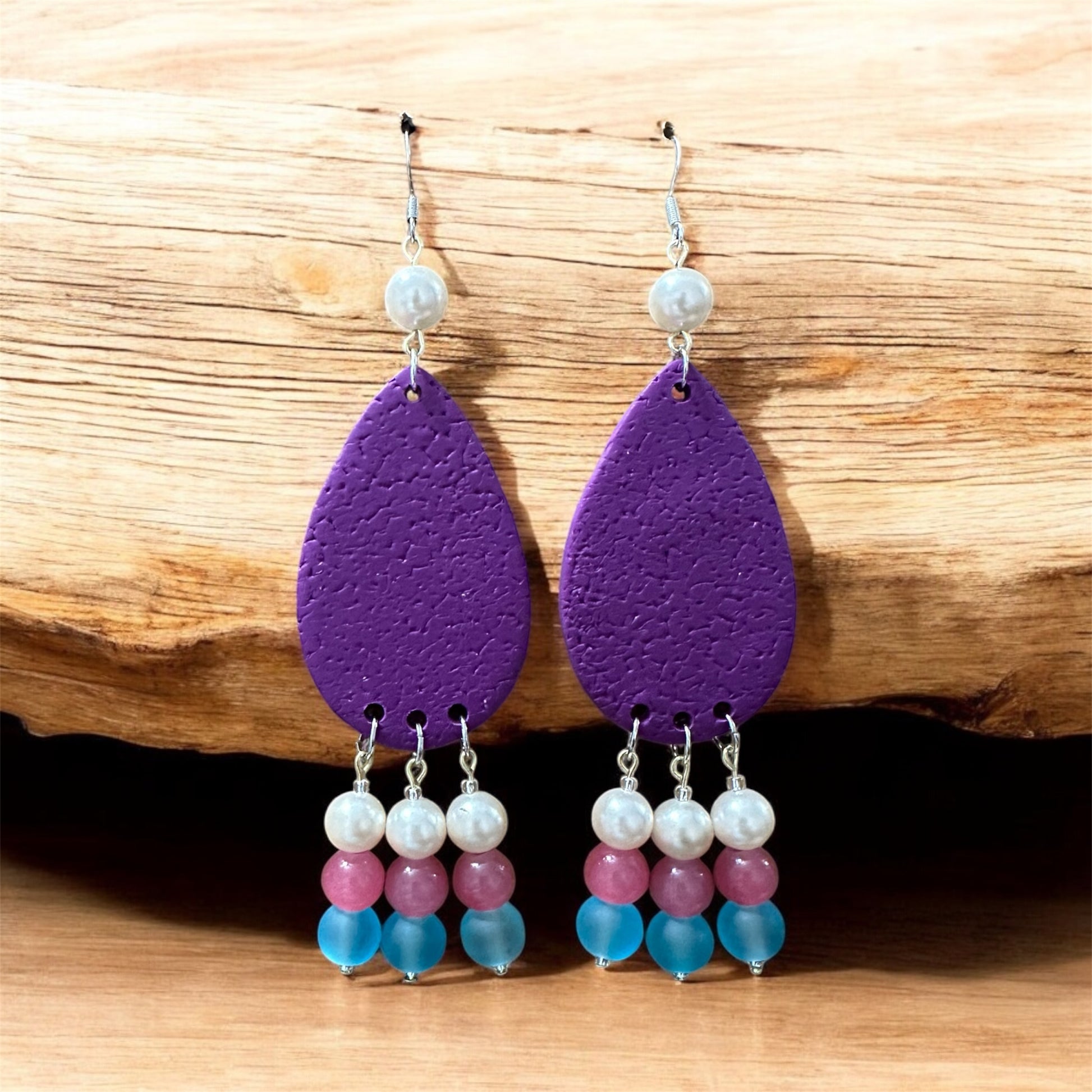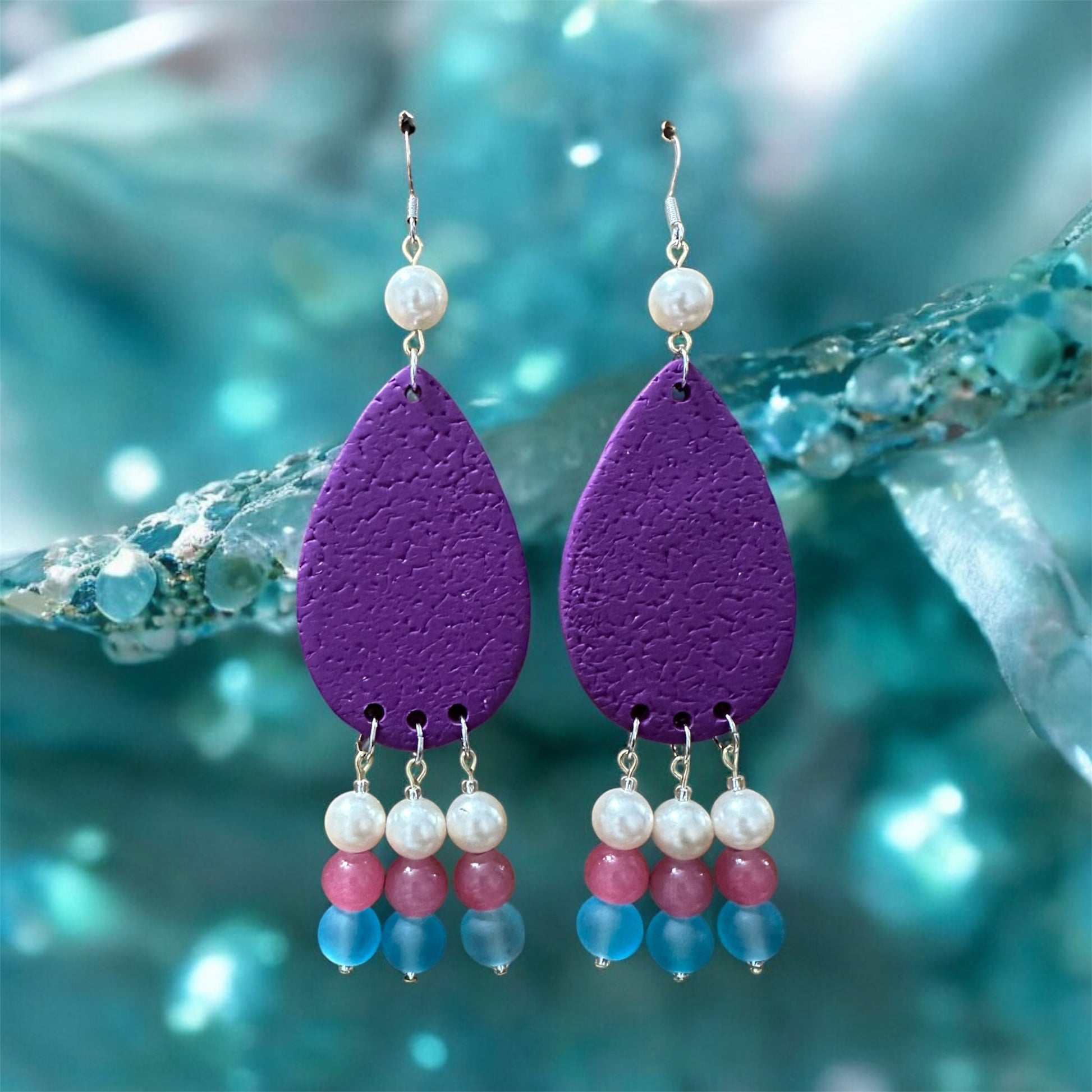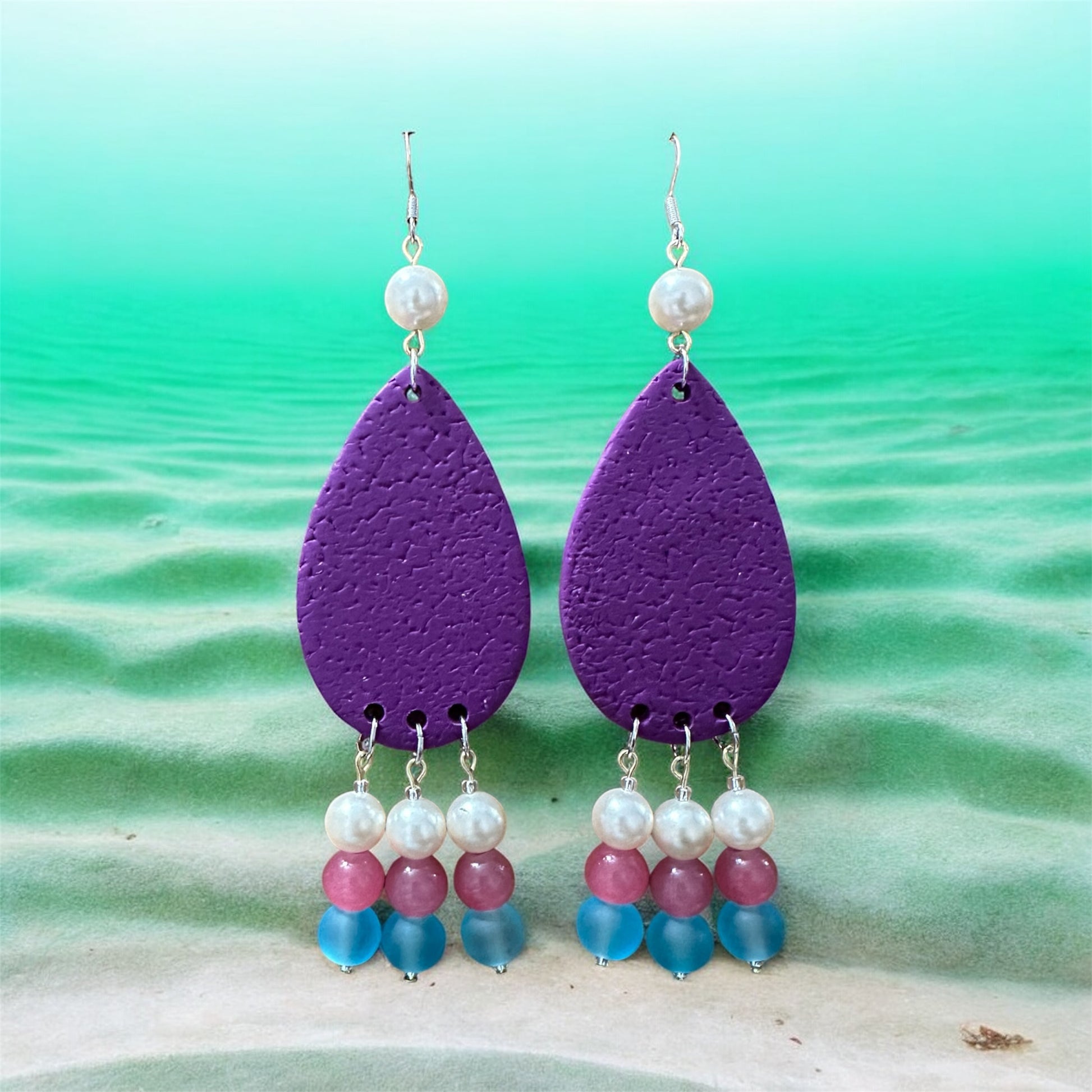 Channel the magic of ocean depths with these enchanting teardrop earrings, where a rich violet base, textured like sea-tossed shells, forms the backdrop for dangling strands of pearl-white, coral-pink, and aquamarine beads — a palette that feels plucked straight from a mermaid’s treasure trove. Light dances across the beads like sunlit ripples on the sea, making them the perfect accessory for anyone longing for a touch of underwater wonder.
